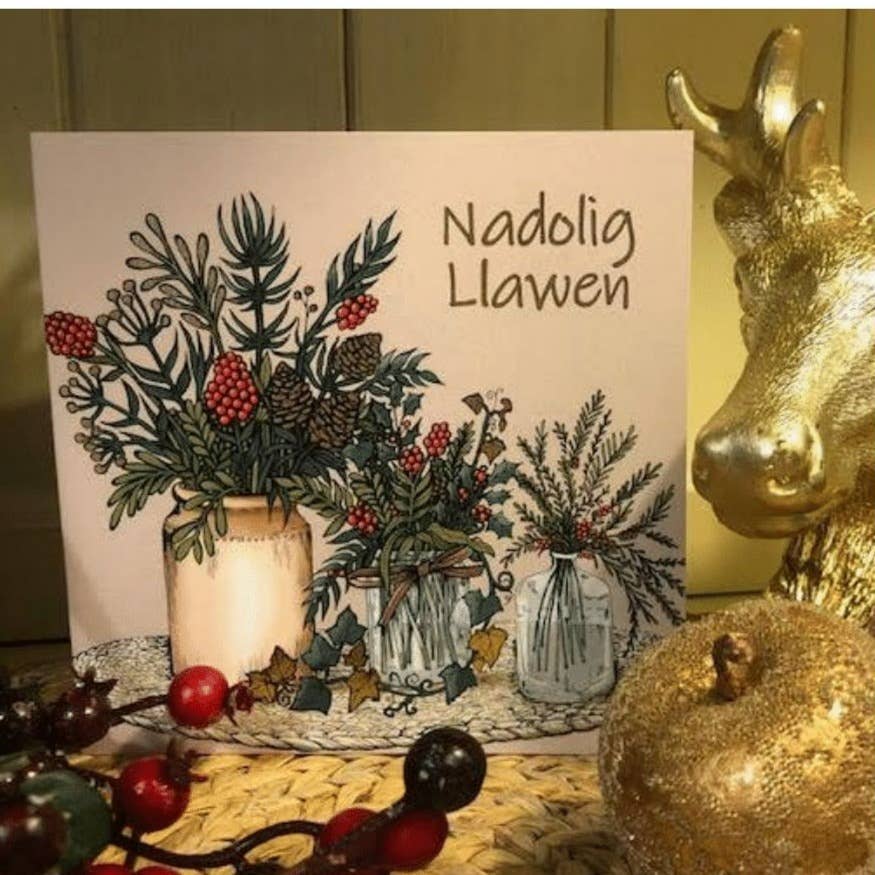 The illustration features an illustration of vases filled with festive winter foliage against a cream background. This Welsh language Christmas card has the festive greeting 'Nadolig Llawen' which translates to 'Merry Christmas'.
