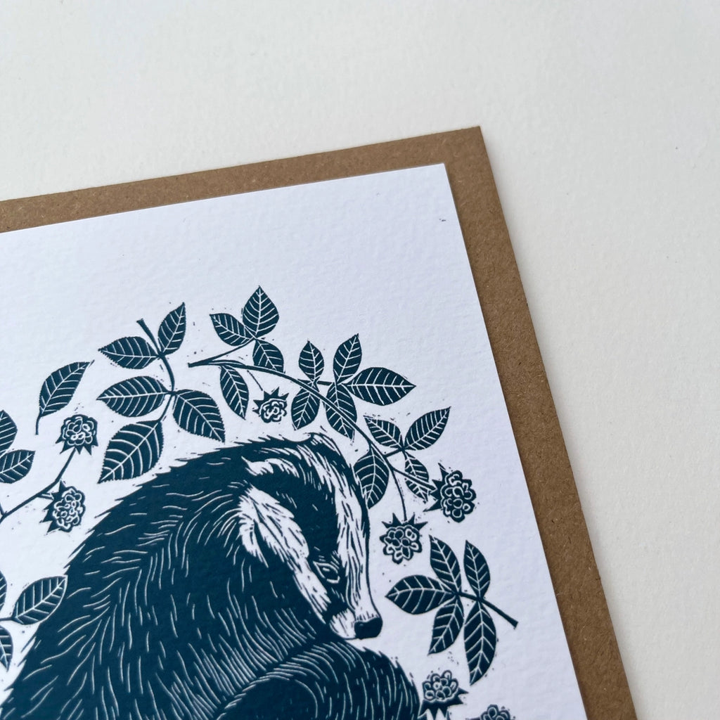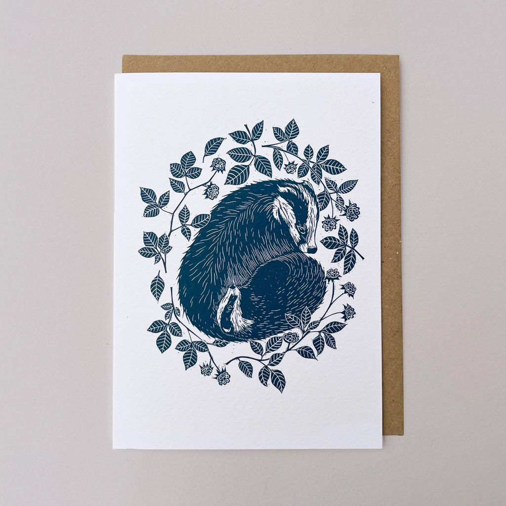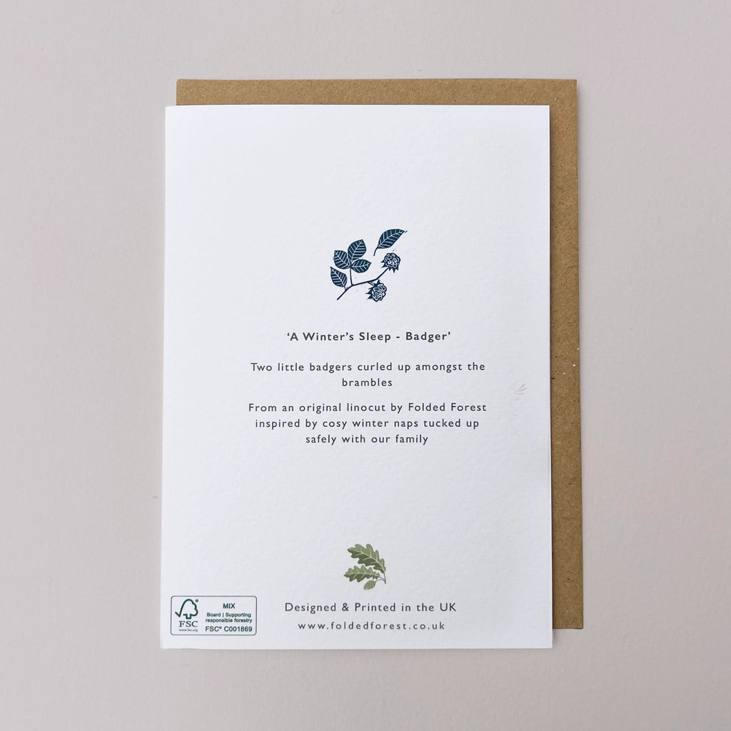 This beautiful greeting card features a badger and a tiny baby badger, curled up for a winter’s sleep nestled amongst the blackberry leaves. This badger design is taken from Folded Forest's original lino print which was hand carved and printed in their Yorkshire studio, and Inspired by cosy winter naps being tucked up snug with our families.