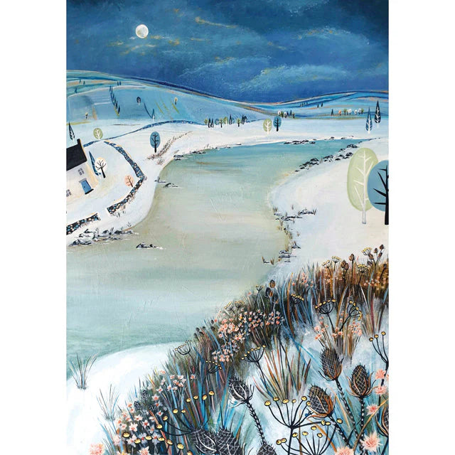 Blank inside for you to write your own festive message. This wintery Christmas card features a snow covered landscape with a winding river under a moonlit sky with wintery foliage.