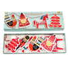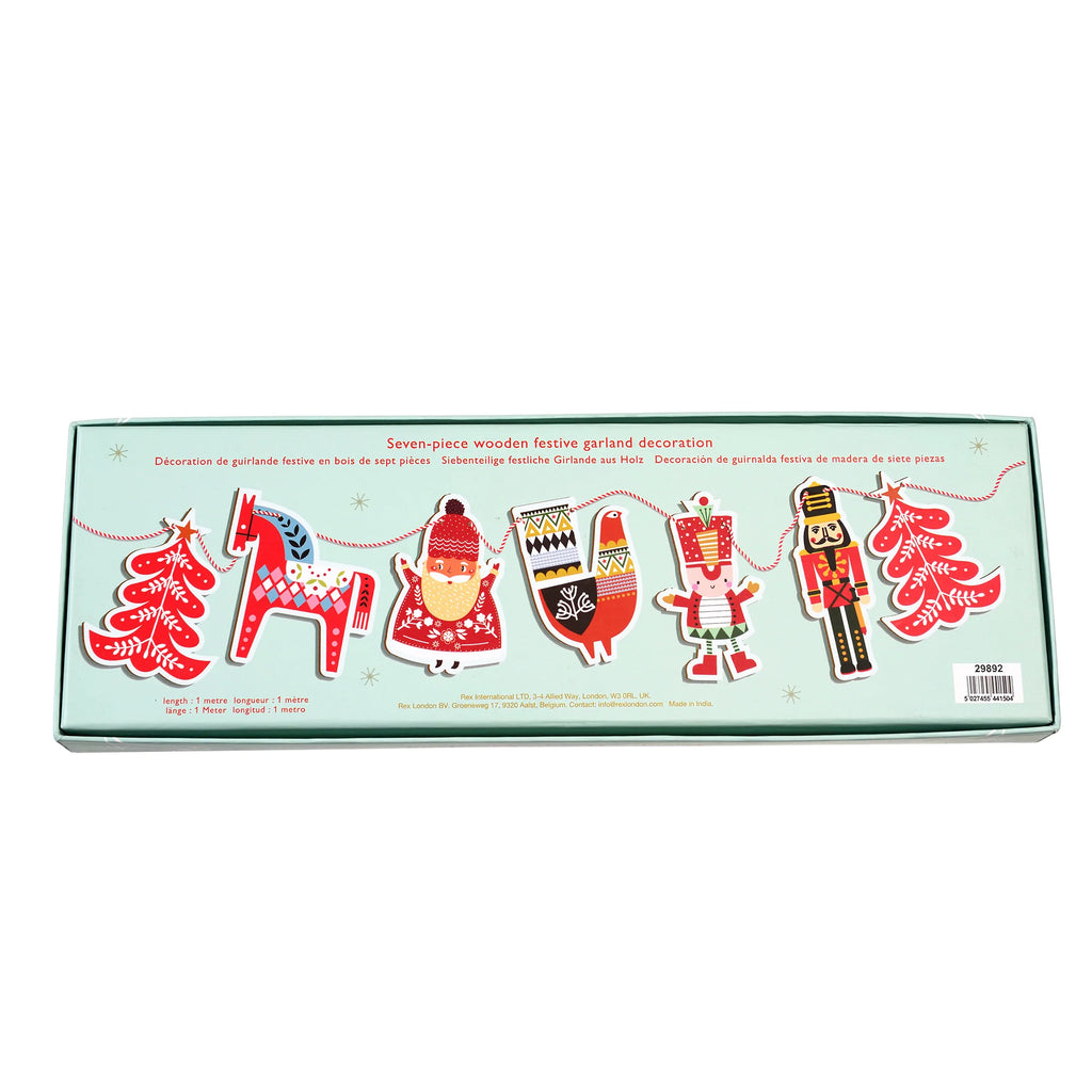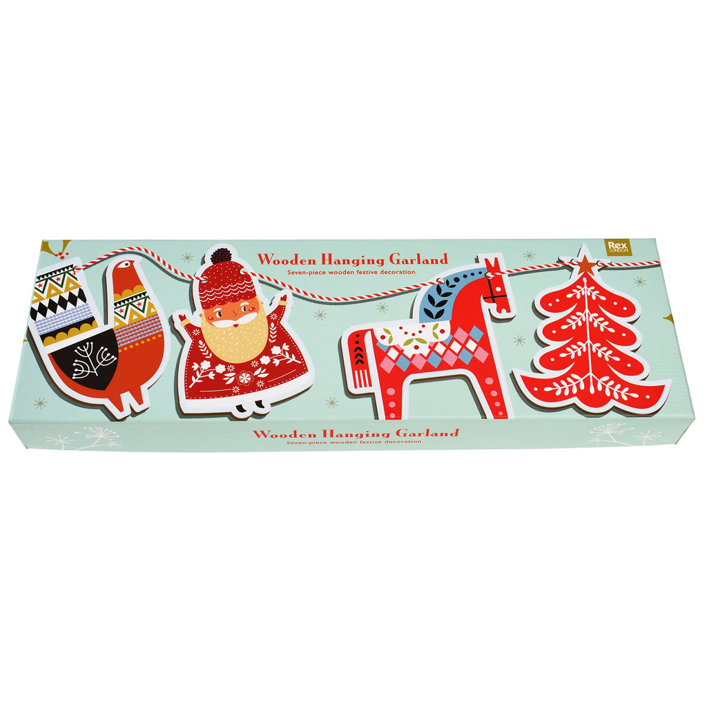 This Wooden Hanging Christmas Garland from Rex London  featuring seven traditional festive characters including Christmas trees, Father Christmas, Turkey, Nutcrackers and horses illustrated in a Scandi style.
