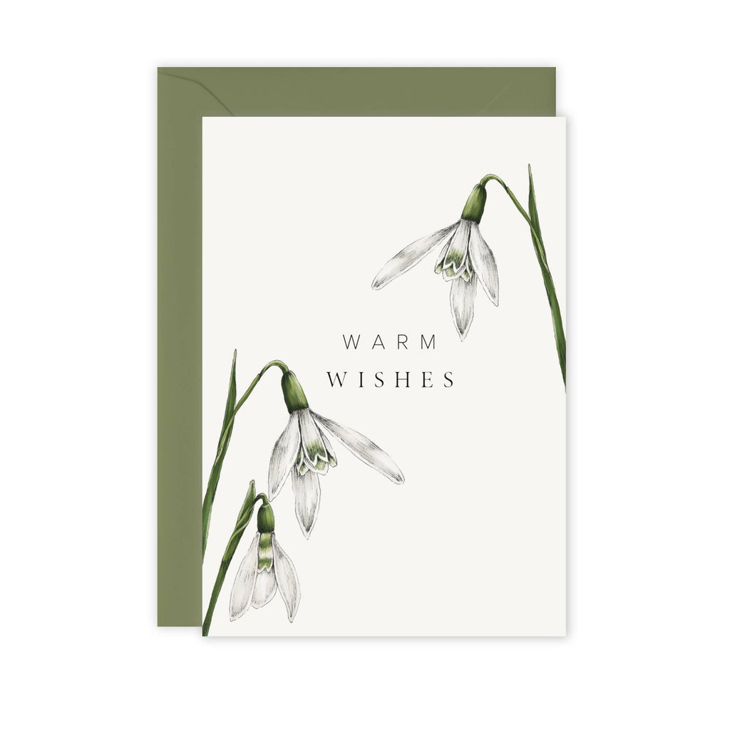 Featuring delicately drawn snowdrops against a white background with the festive greeting 'Warm Wishes'.