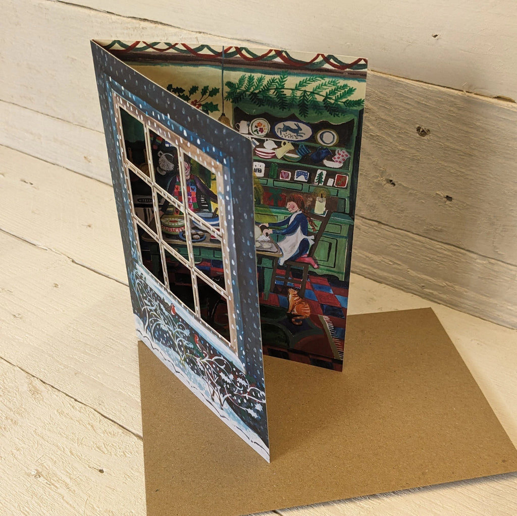 The window on the front of the card has been laser-cut to show an illustration of a cosy interior scene of a family baking Christmas treats.
