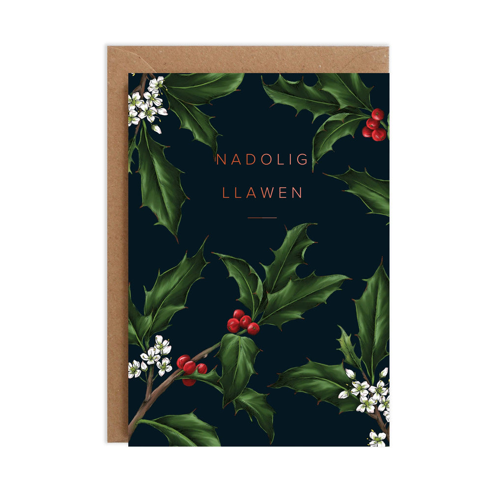 Featuring delicately drawn sprigs of evergreen holly with red and white berries against a black background with the festive Welsh greeting 'Nadolig Llawen' which translates to 'Merry Christmas'.