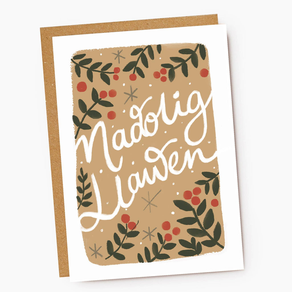 Featuring a modern calligraphy design with 'Nadolig Llawen' written in a flowing script, surrounded by green foliage and berries against a brown background.
