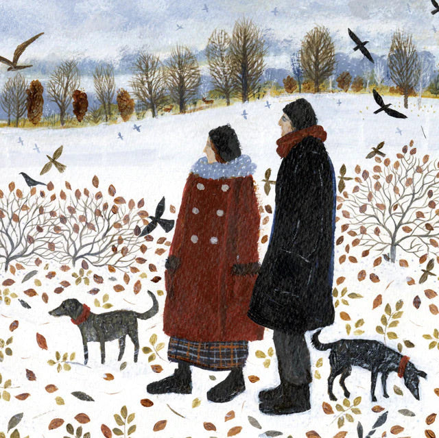 Blank inside for your own message. This wintery Christmas card features a couple walking their dogs through a woodland with snow and fallen leaves covering the ground.