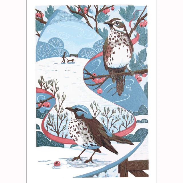 This Redwing and Fieldfare Greeting Card from Green Pebble features a reproduction of a linocut from artist Louise Edwards.