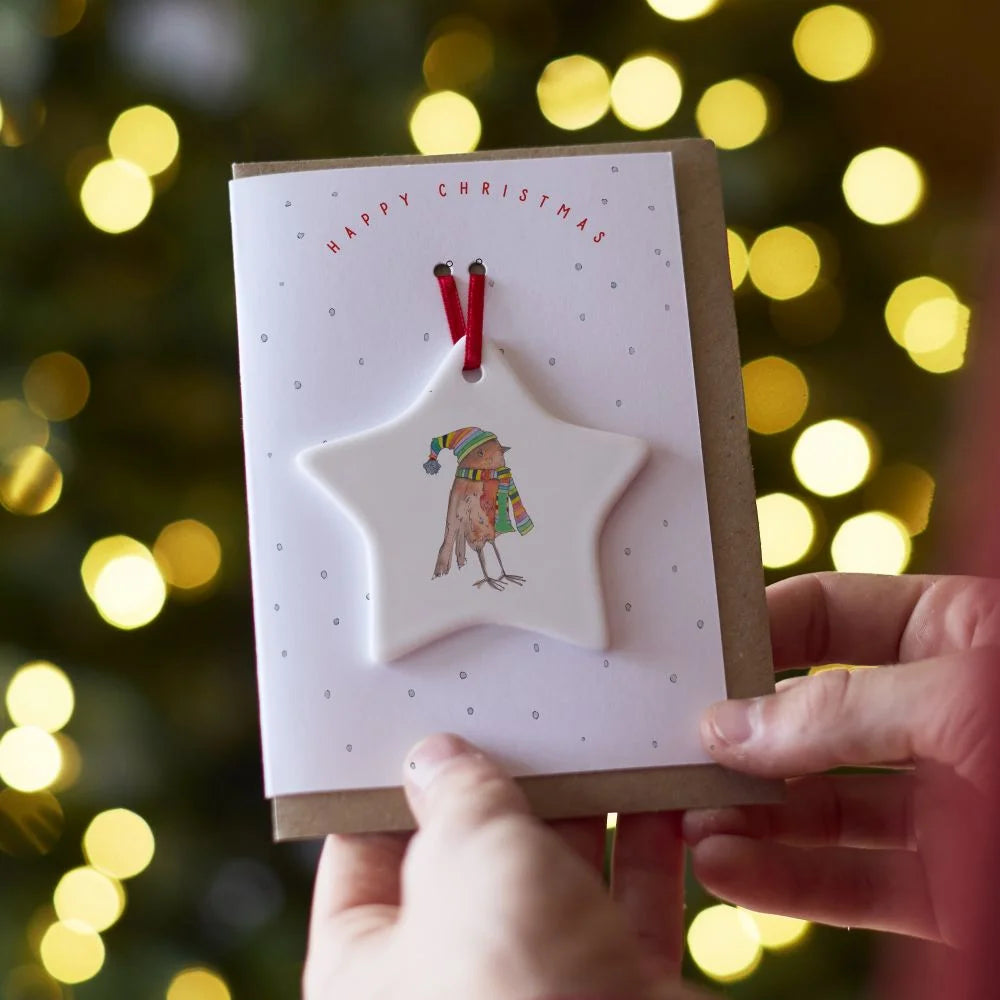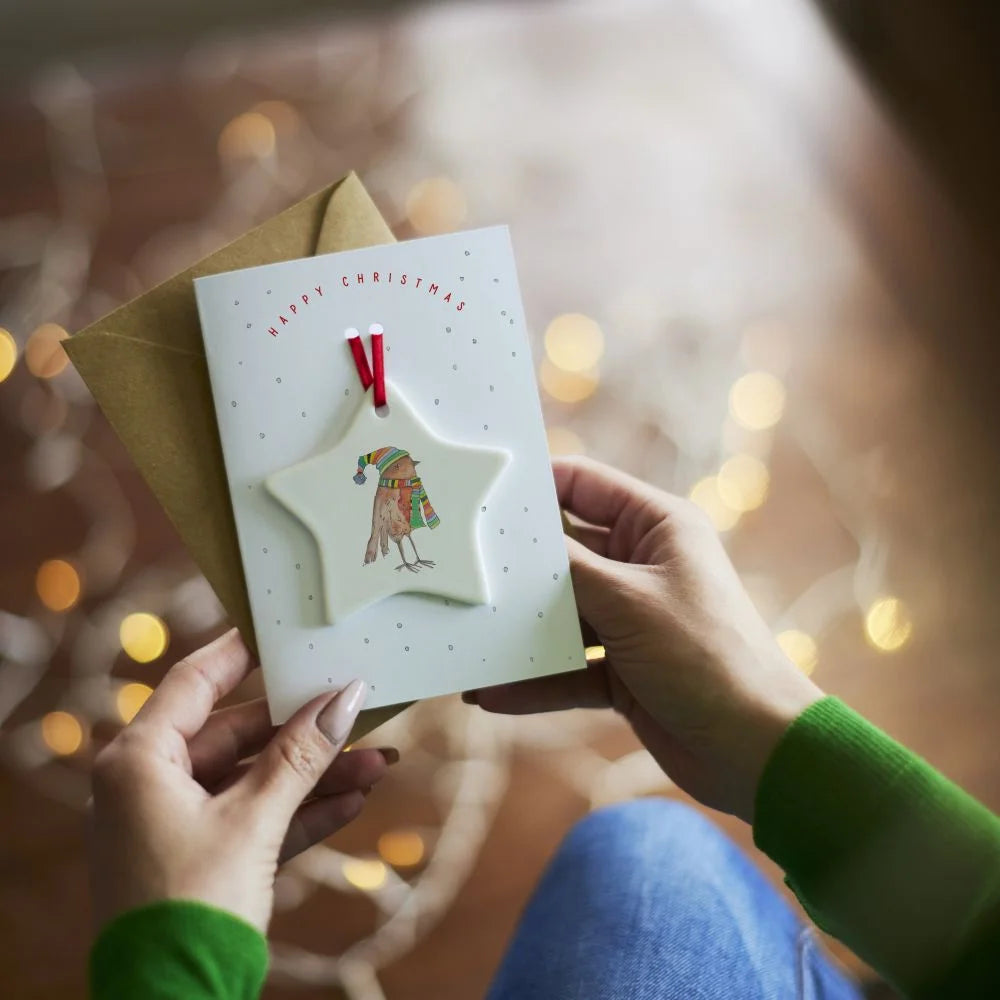 Printed on high-quality brilliant white 300GSM FSC certified board the card has a festive greeting of 'Happy Christmas'. The card comes with a detachable ceramic star shaped decoration which hangs from red coloured ribbon, on the decoration there is a festive robin wearing a cosy hat and scarf.