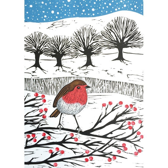 This Robin and Field Christmas Card from Green Pebble features a reproduction of a linocut from artist Jane Dignum.