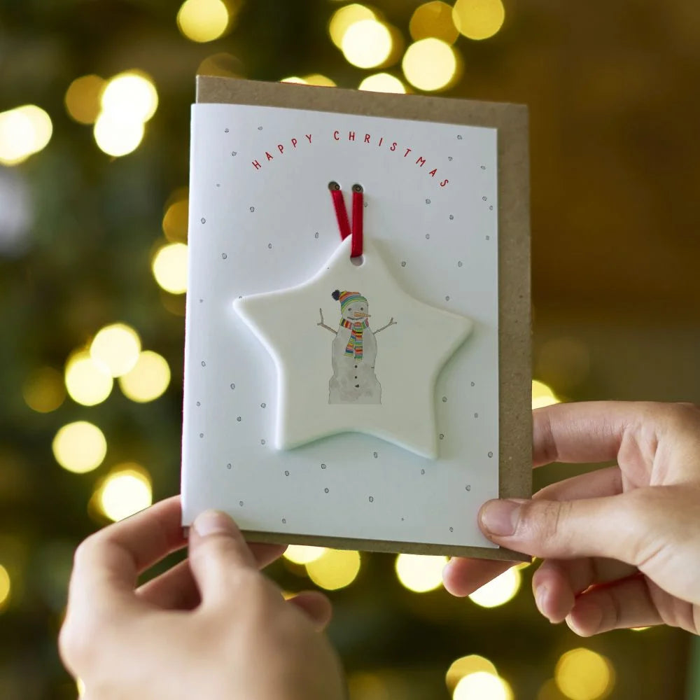 The Snowman Keepsake Christmas Card comes with a detachable ceramic star shaped Christmas decoration which hangs from red coloured ribbon, on the decoration there is a wintery Snowman wearing a cosy hat and scarf.