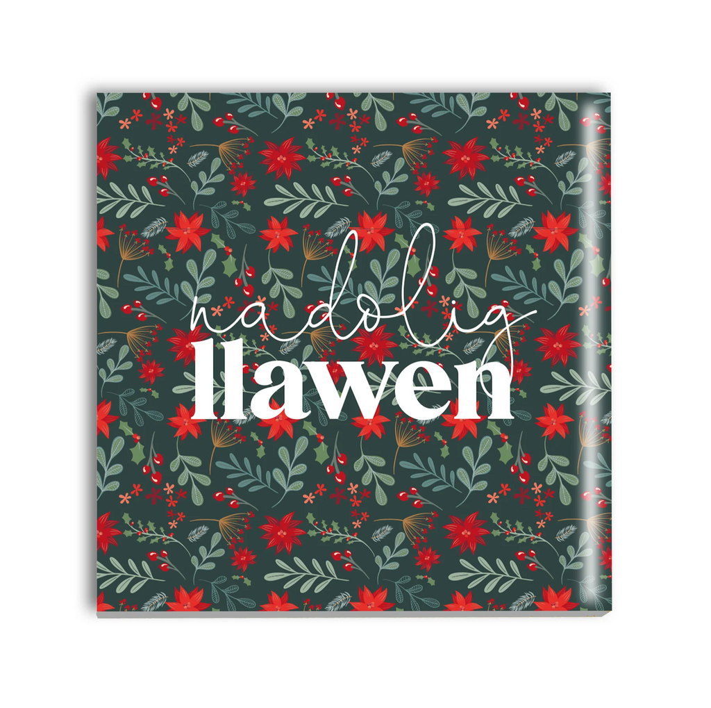 The design features a festive selection of winter foliage and the Welsh Christmas greeting "Nadolig Llawen" which translates to "Merry Christmas".