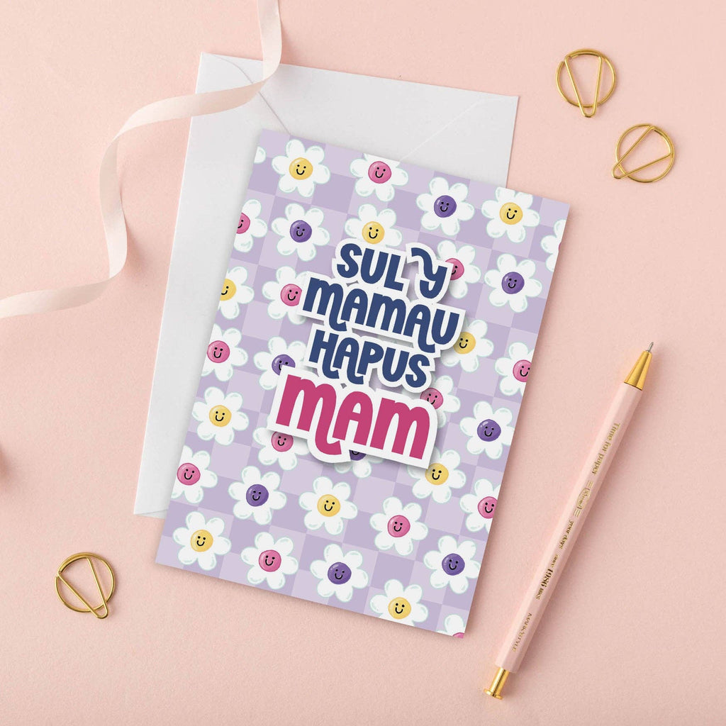 Featuring an illustration of a cheerful white flowers with colourful centres set against a pale lilac background, this Welsh language card has the greeting "Sul y Mamau Hapus Mam" which translates to the "Happy Mother's Day Mam".