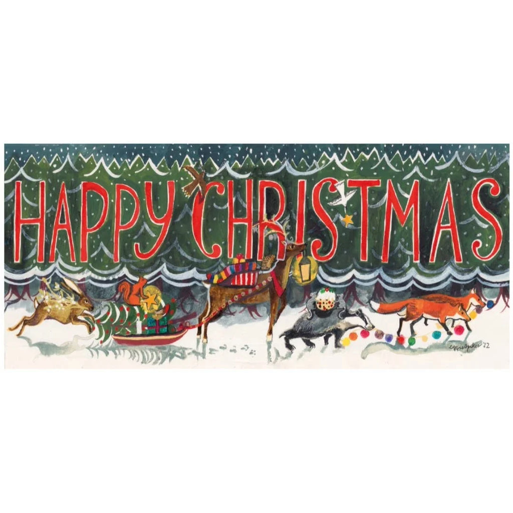 Featuring a festive illustration of a woodland scene, with a reindeer pulling a sleigh full of presents along with a hare, badger and fox all carrying twinkling lights. The greeting above the procession reads 'Happy Christmas' in Lizzie's distinct handwriting.