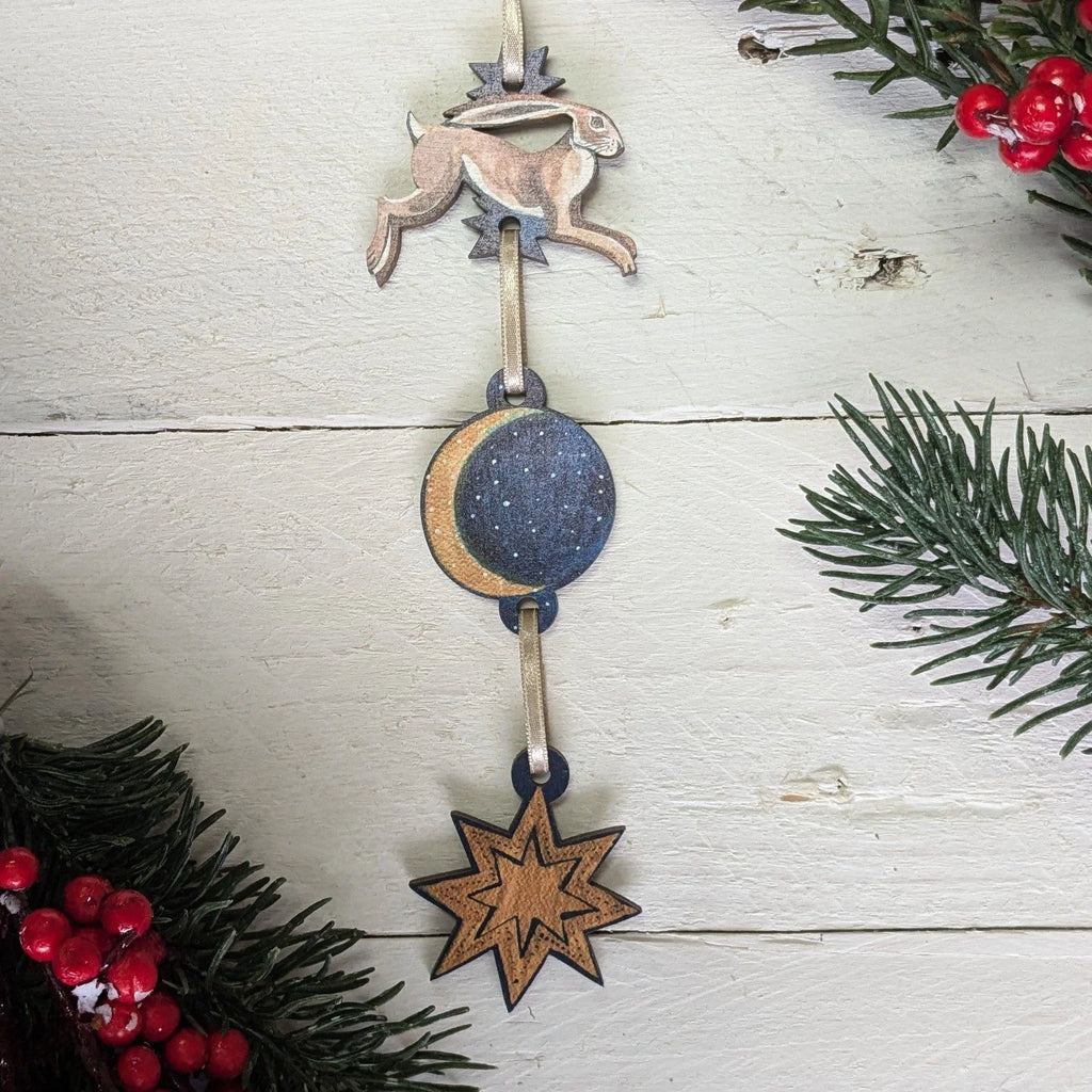 This Moon Stars and Hare Three Tier Laser Cut Decoration from Driftwood Designs features three laser-cut decorations. The beautiful illustrations of a leaping hare, a crescent moon against a starry night sky and golden star hang from a golden coloured satin ribbon. The celestial design make this hanging decoration perfect for many seasons, be it spring, autumn, or Christmas. It also makes a thoughtful gift for a loved one.
