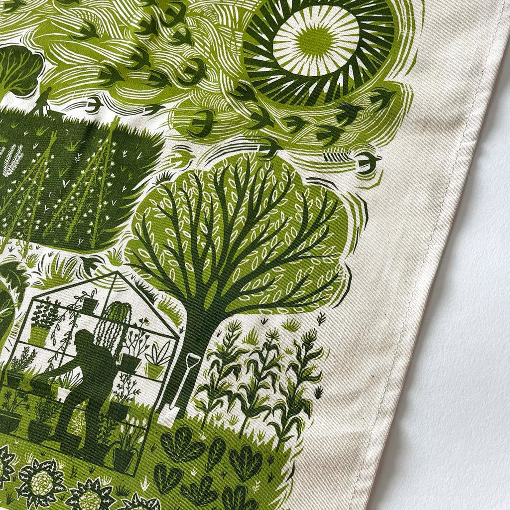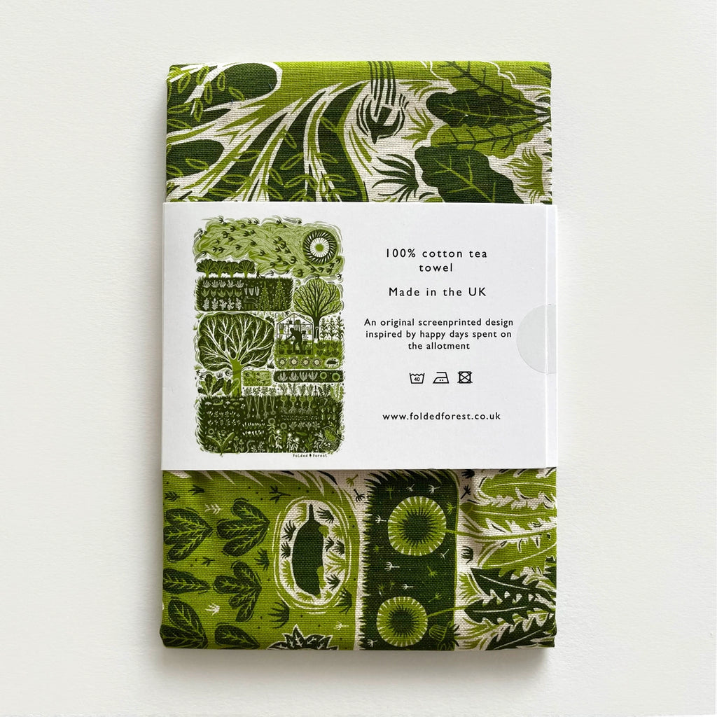 This 100% natural cotton tea towel has been screen printed with Folded Forest's original paper cut design. Drawing inspiration from designer Ruth's father's allotment and all the happy family days spent gardening, digging, sowing and harvesting.