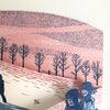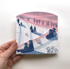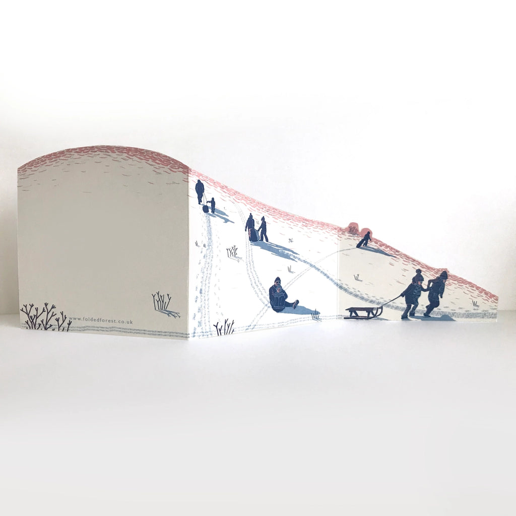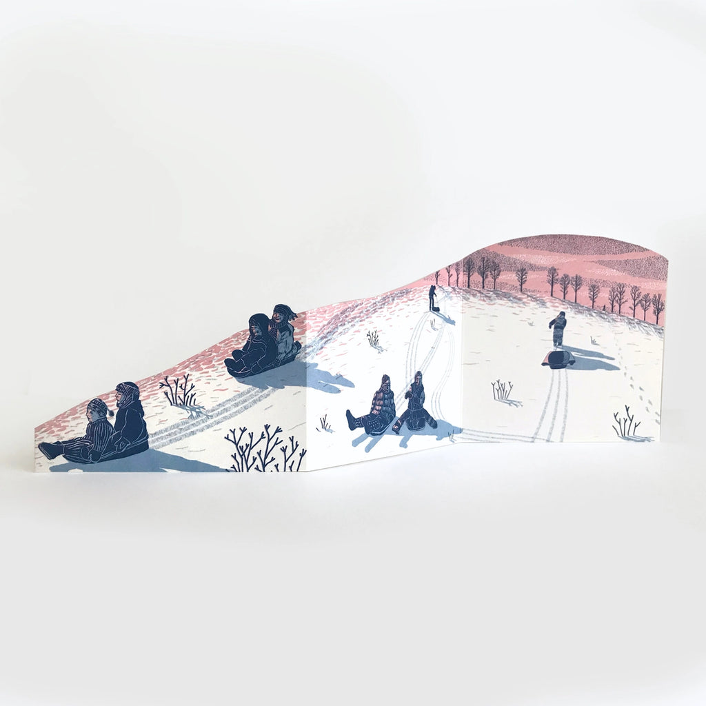 The concertina card unfolds to reveal a snowy sledging scene against a pink sunset sky. The design is inspired by childhood memories of snowy days, staying out sledging all day until the sun sits low casting pink & purple shadows across the snow.