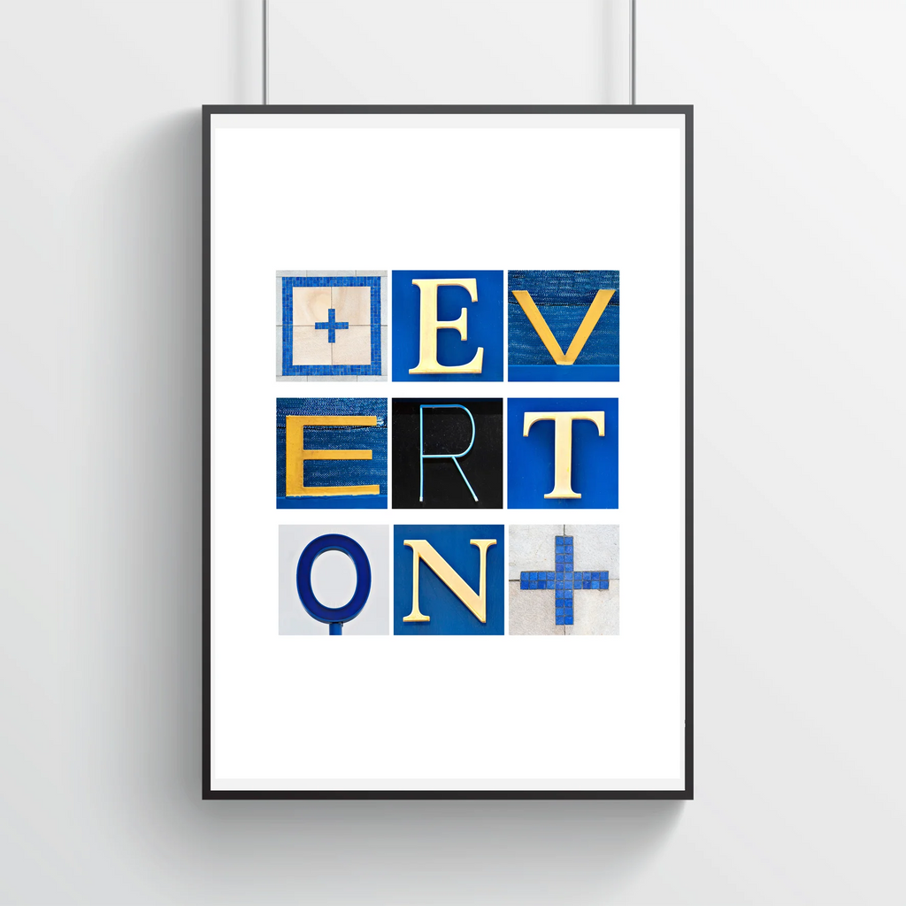 This Unframed Everton Football Letters from Liverpool A4 Art Print from Fonted has been created using photographs of letters found around Goodison Park.