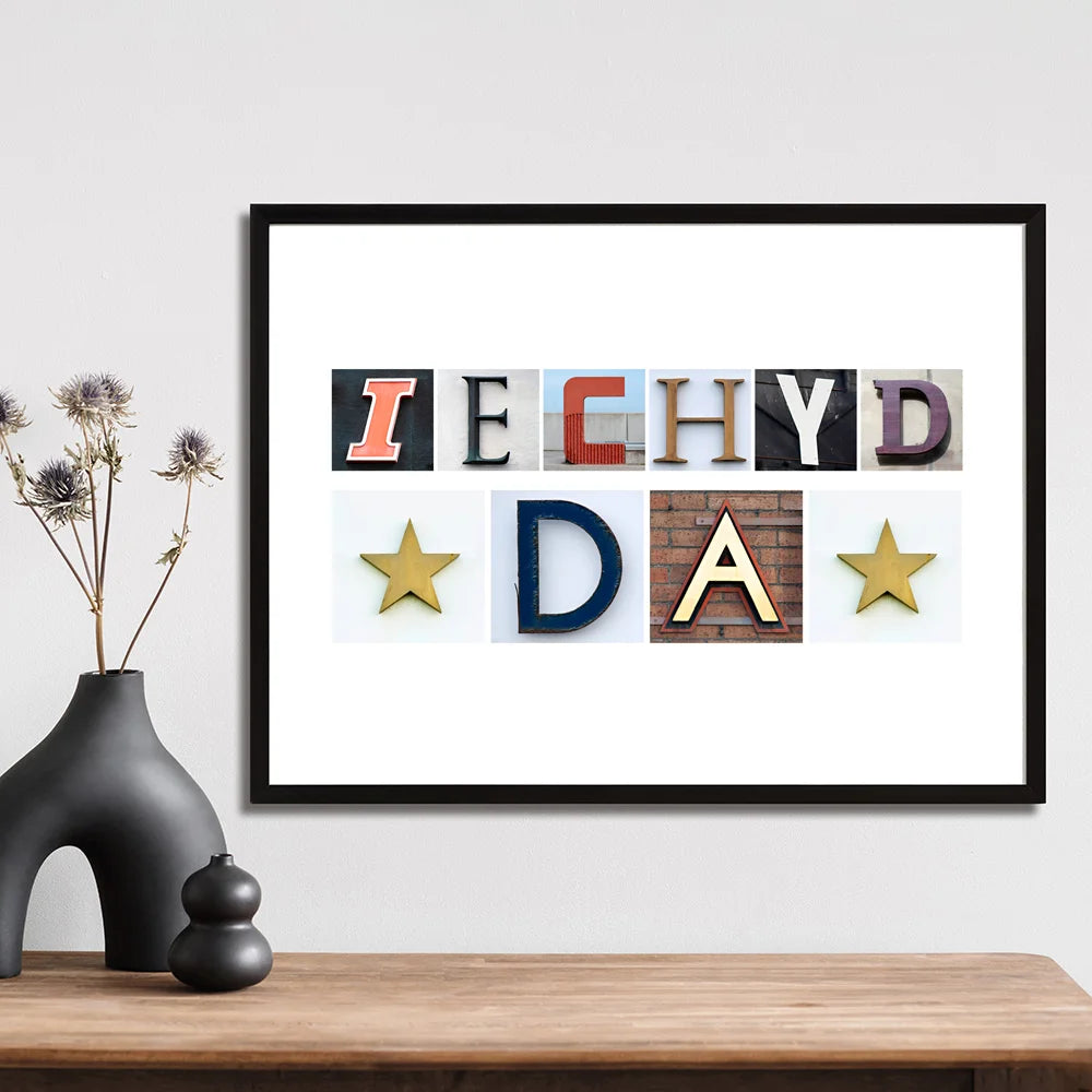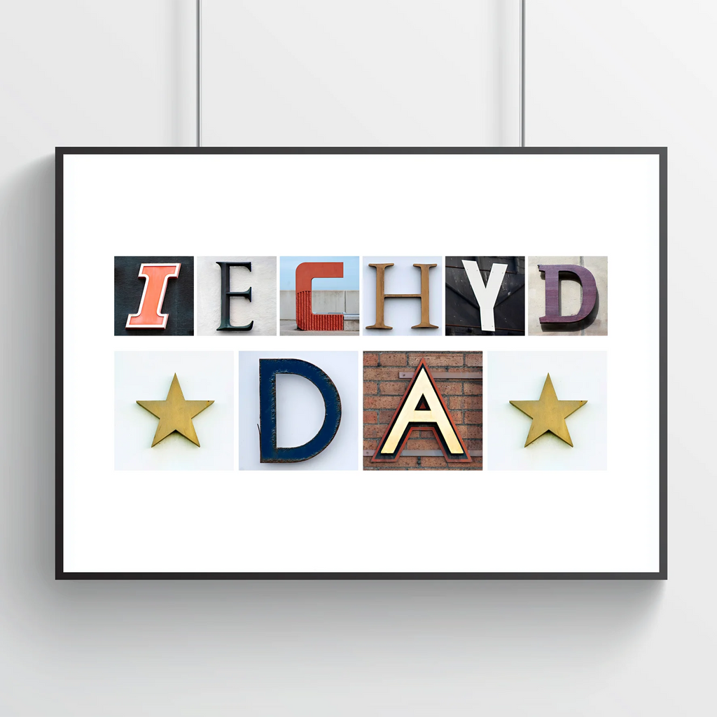 This Unframed Iechyd Da Letters from North Wales A4 Art Print from Fonted has been created using photographs of letters from building in North Wales.