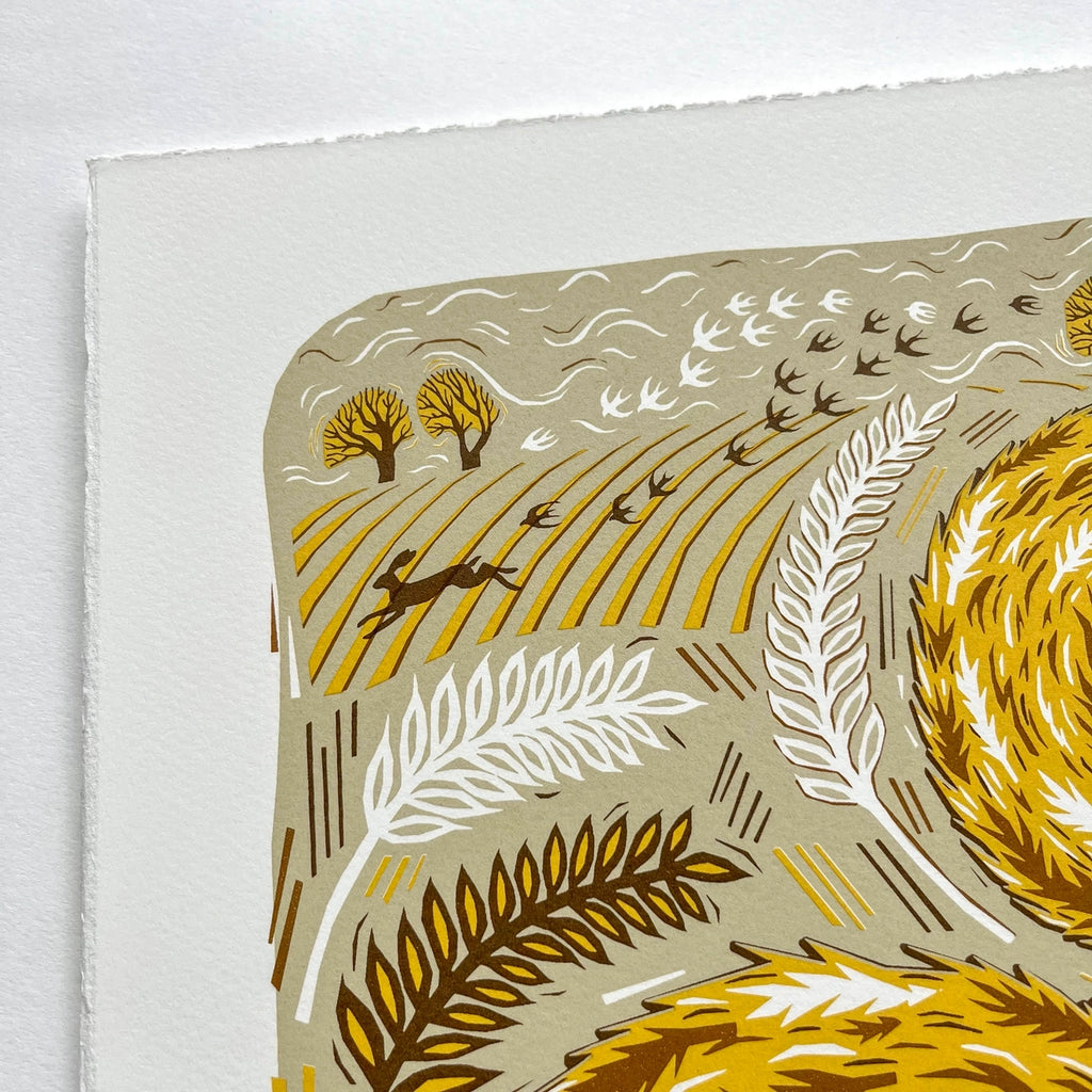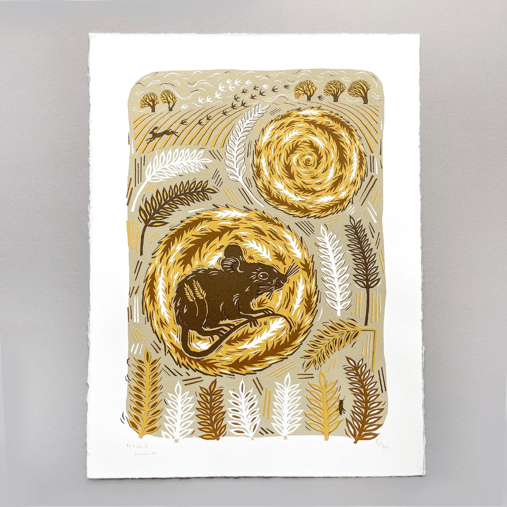 Inspired by memories of harvest time, the print features a tiny harvest mouse hiding inside a bale whilst in the distance a hare leaps across the rows of hay.