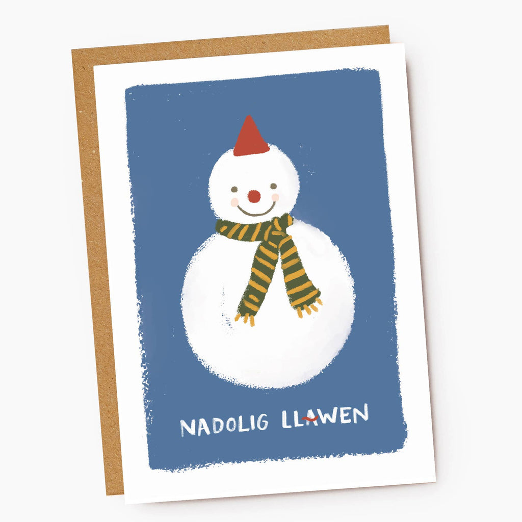 Featuring a cute illustration of a snowman wearing a snug woolly scarf and hat, with the Welsh Christmas greeting 'Nadolig Llawen' which translates to 'Merry Christmas'.