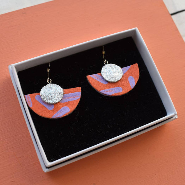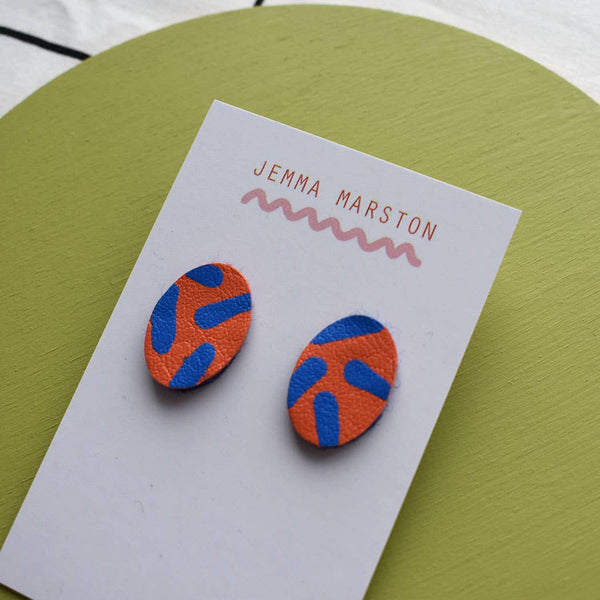Jemma's jewellery is designed through experimenting with print, embroidery and embellishment techniques. The colourful leather Jemma uses is tactile, flexible and lightweight making it perfect for transforming into jewellery.