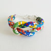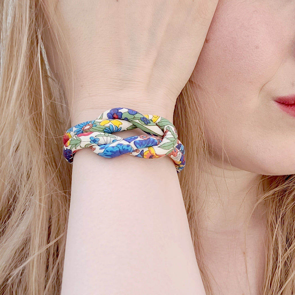 The bracelet boasts a simple reef knot design, intricately created with Liberty fabric-covered cord.
