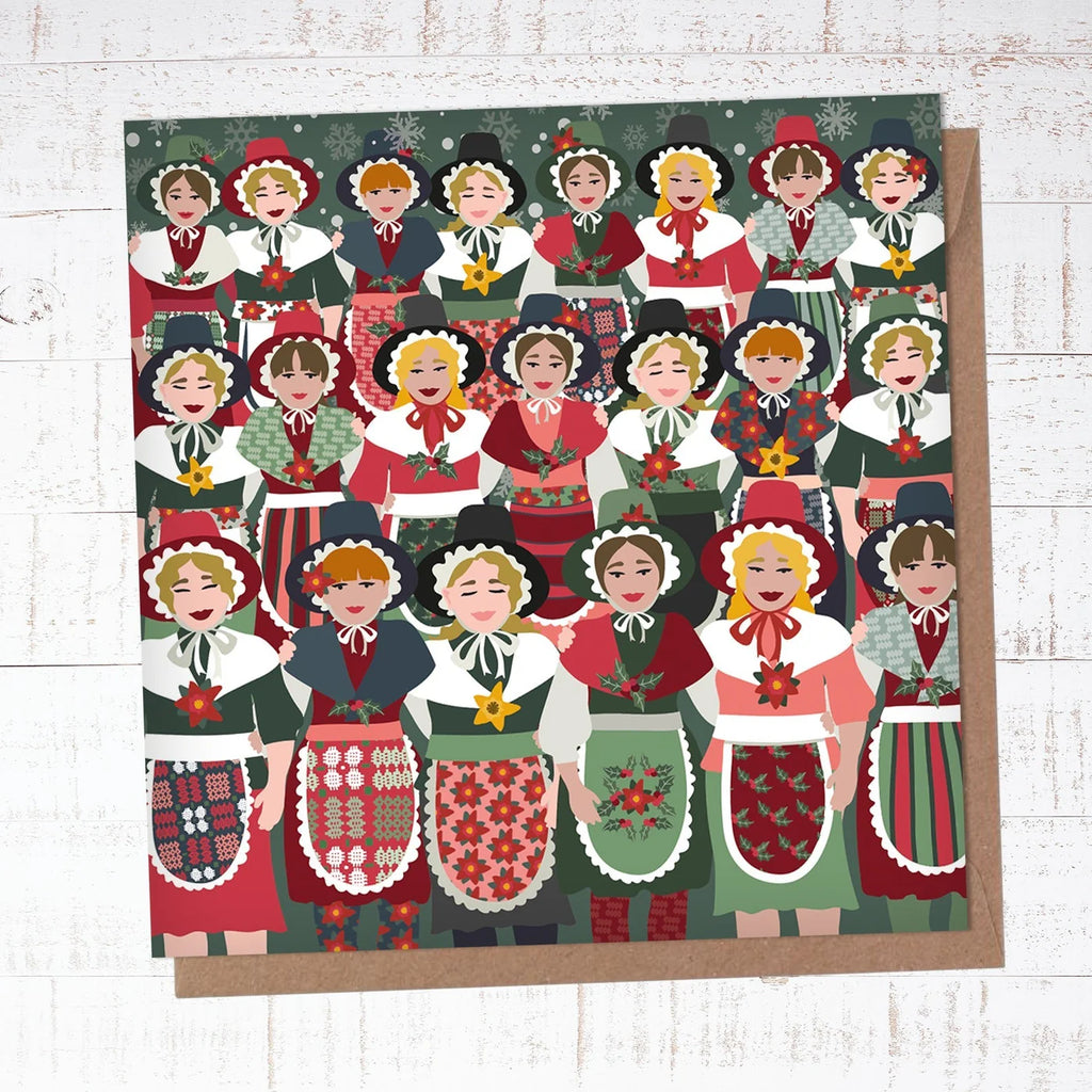 Featuring an illustration of a Welsh ladies in traditional costume but with a festive twist. Wearing sprigs of holly and poinsettias along with daffodils.