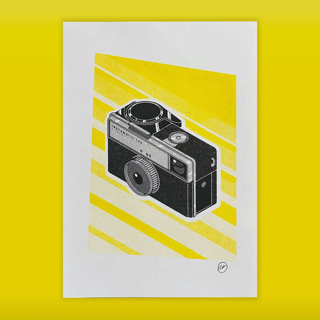 Inspired by his love of retro gadgets and physical media, the Kodak Instamatic 133, a compact camera beloved for its pocketable design and satisfyingly simple click has been drawn by Matthew and printed using a Risograph printer using two colours of ink [Yellow and Black].