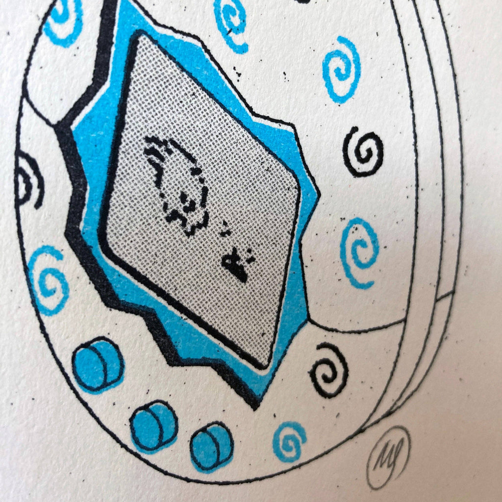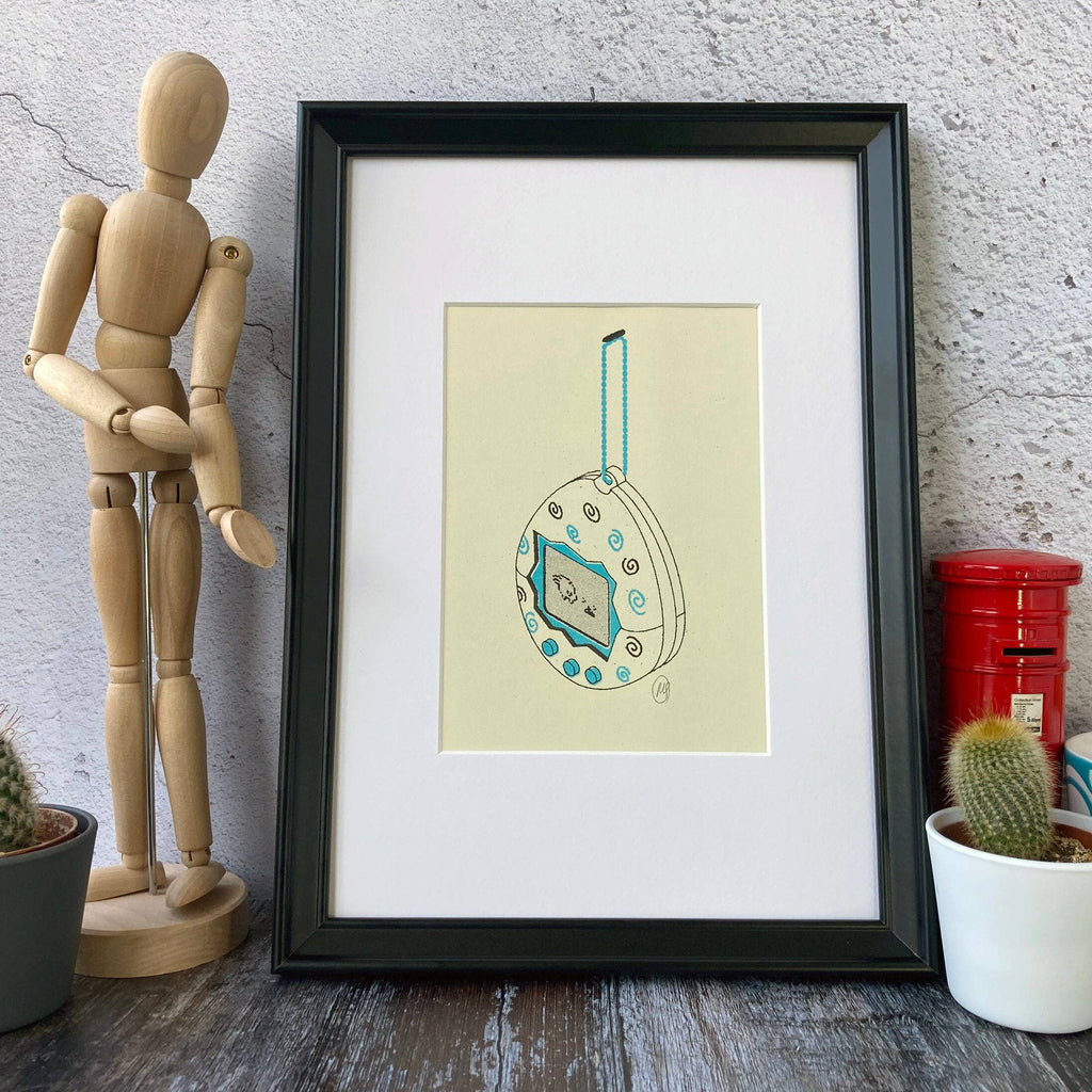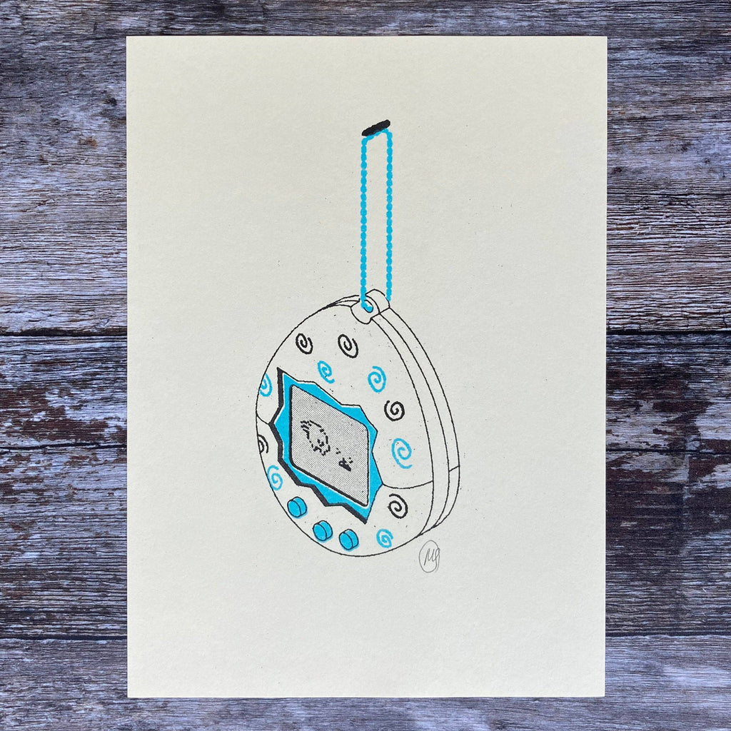 Inspired by retro gadgets this cute Tamagotchi Risograph Art Print has been drawn by Matthew and printed using a Risograph printer using two colours of ink. The Tamagotchi was a popular virtual digital pet from Japan in the 90's - this art print is an ideal gift for nostalgic 90's kids.