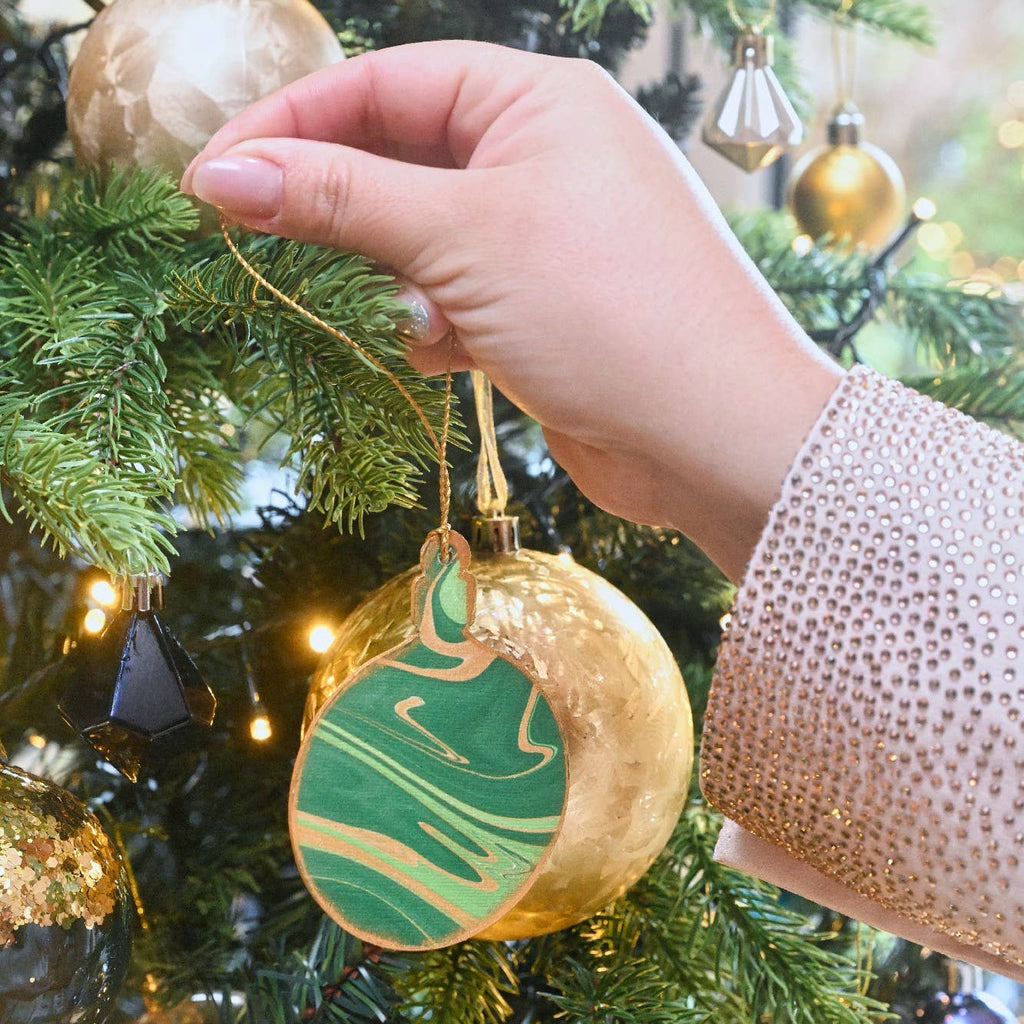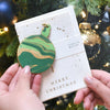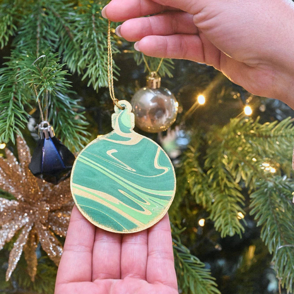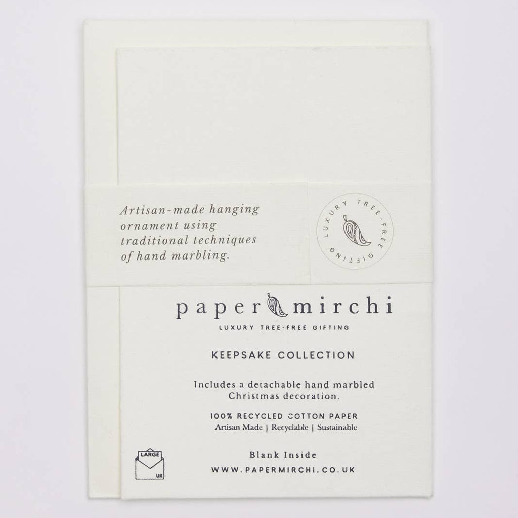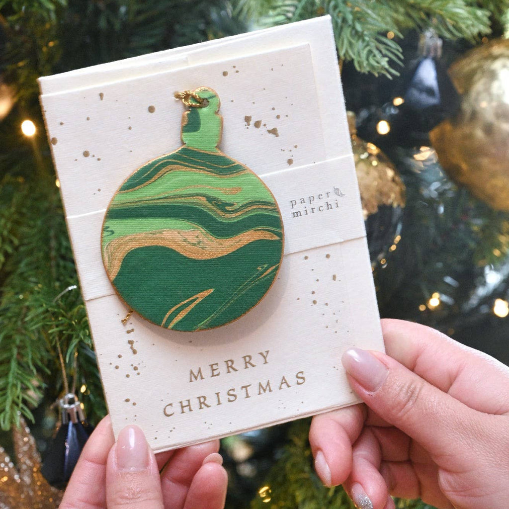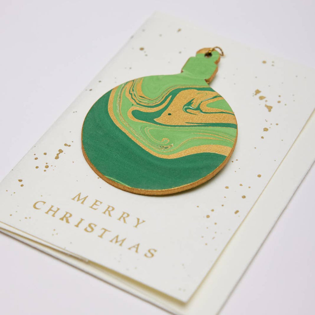 Handcrafted by skilled artisans in India, this Emerald Bauble Hand-Marbled Christmas Decoration Greeting Card features a detachable, hand-marbled Christmas decoration with a ready-to-hang gold string. Marbled in festive shades of green and gold, it makes a charming festive keepsake.