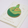 The Christmas decoration is crafted from recycled rigid boxboard and metallic gold string, making it lightweight and easy to hang. The greeting card itself is made from 100% recycled cotton paper and comes with a peel-and-seal envelope. The festive message "Merry Christmas" is printed in gold on the front, making it a beautiful way to send festive cheer to a loved one this Christmas.