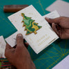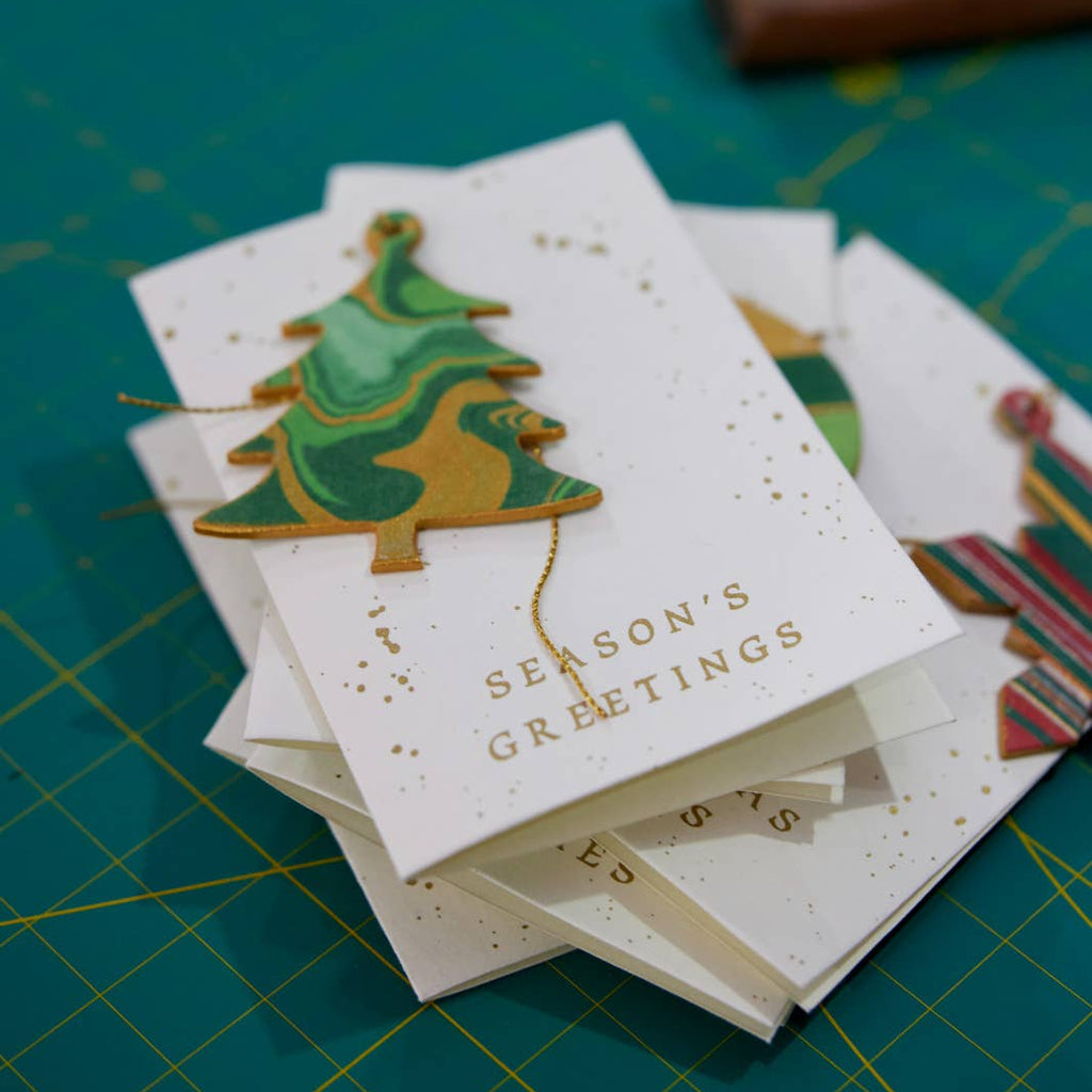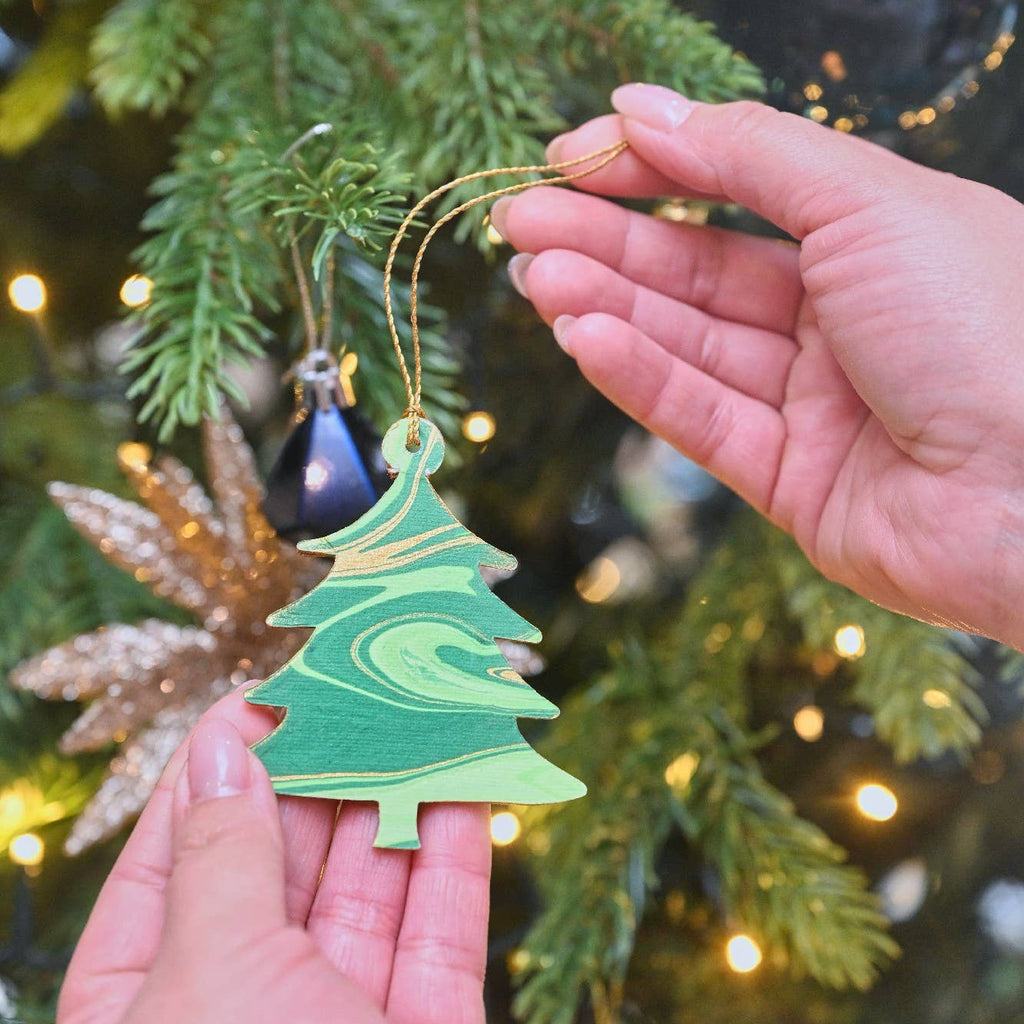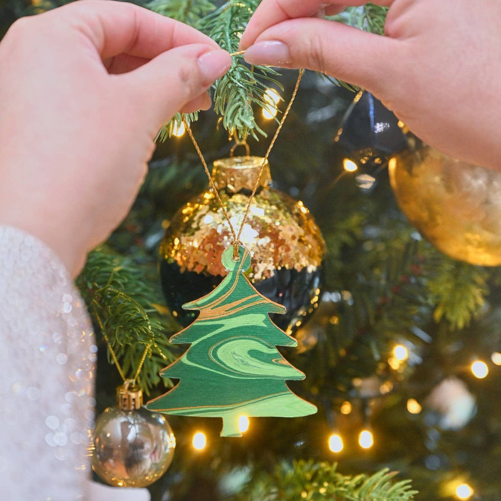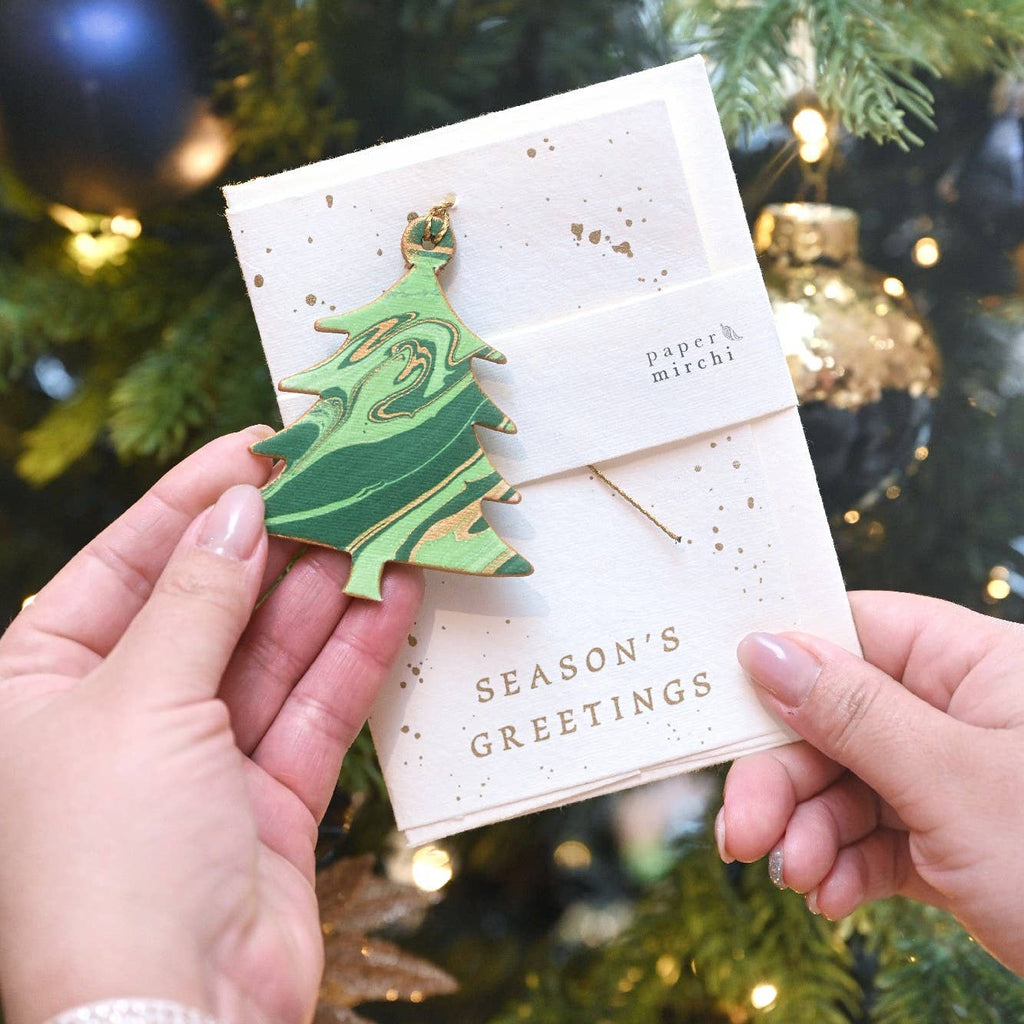 This Emerald Hand Marbled Christmas Card with Christmas Tree Decoration features a detachable, hand-marbled Christmas decoration with a ready-to-hang gold string.