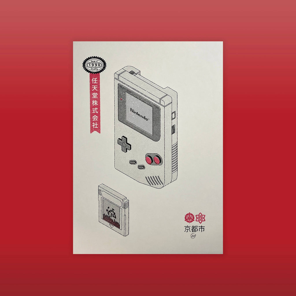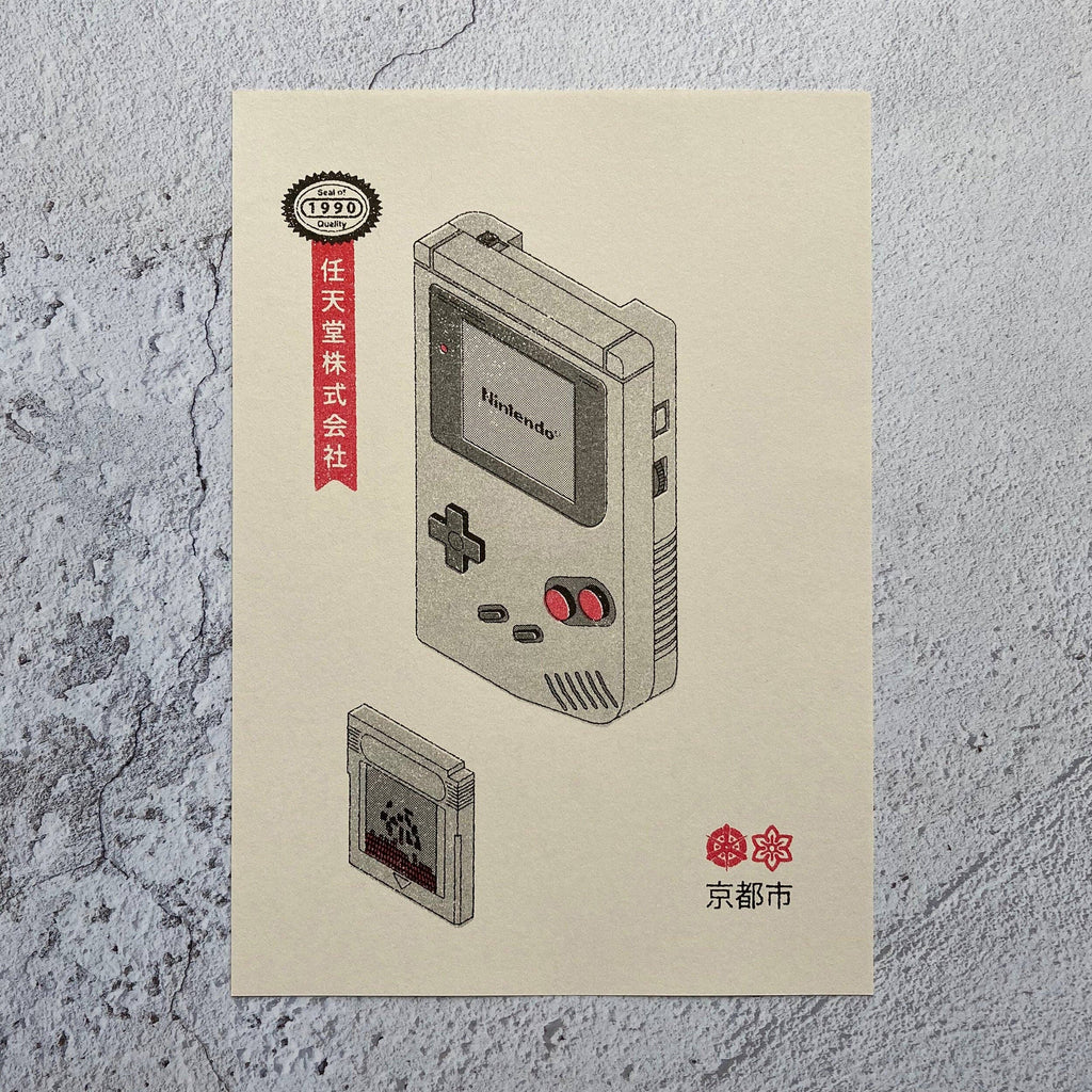 Inspired by Japanese wood block prints and mid century design this retro gaming print of the iconic Nintendo Gameboy has been printed in two colours and celebrates the handheld game console. It would make the ideal gift for fans of video games and retro gaming.