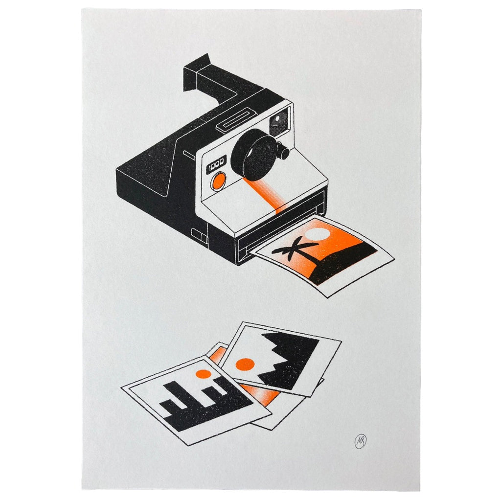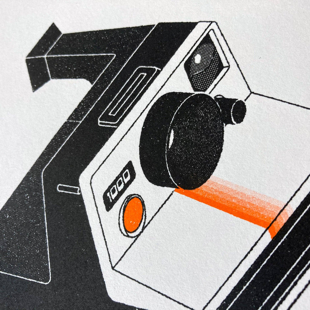 Inspired by retro gadgets and physical media, the iconic Polaroid Land Camera 1000 has been drawn by Matthew and printed using a Risograph printer using two colours of ink [Orange and Black].