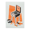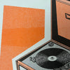 Inspired by retro gadgets and physical media, the vintage style record player and vinyl records have been drawn by Matthew and printed using a Risograph printer using two colours of ink [Orange and Black].