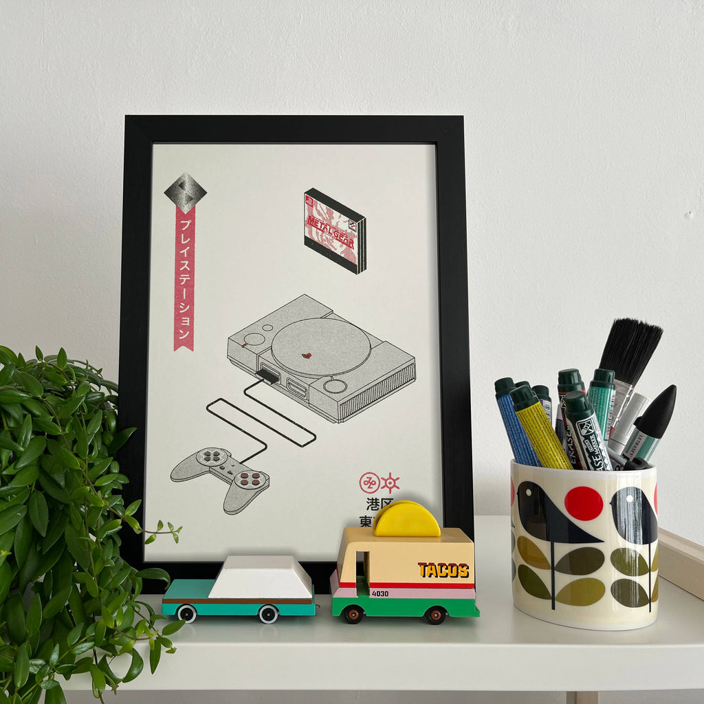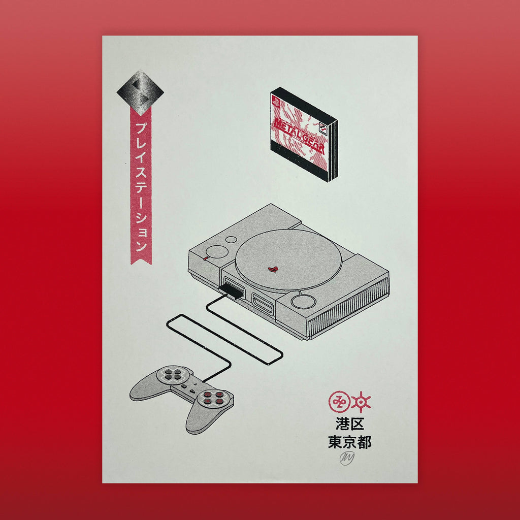 Inspired by classic Japanese advertising and packaging design, with slightly offset layers of colour and texture. The classic games console the Sony Playstation has been rendered as an isometric illustration and printed using a Risograph printer. This print uses two inks, black and red. Each Risograph art print has been signed by the artist.