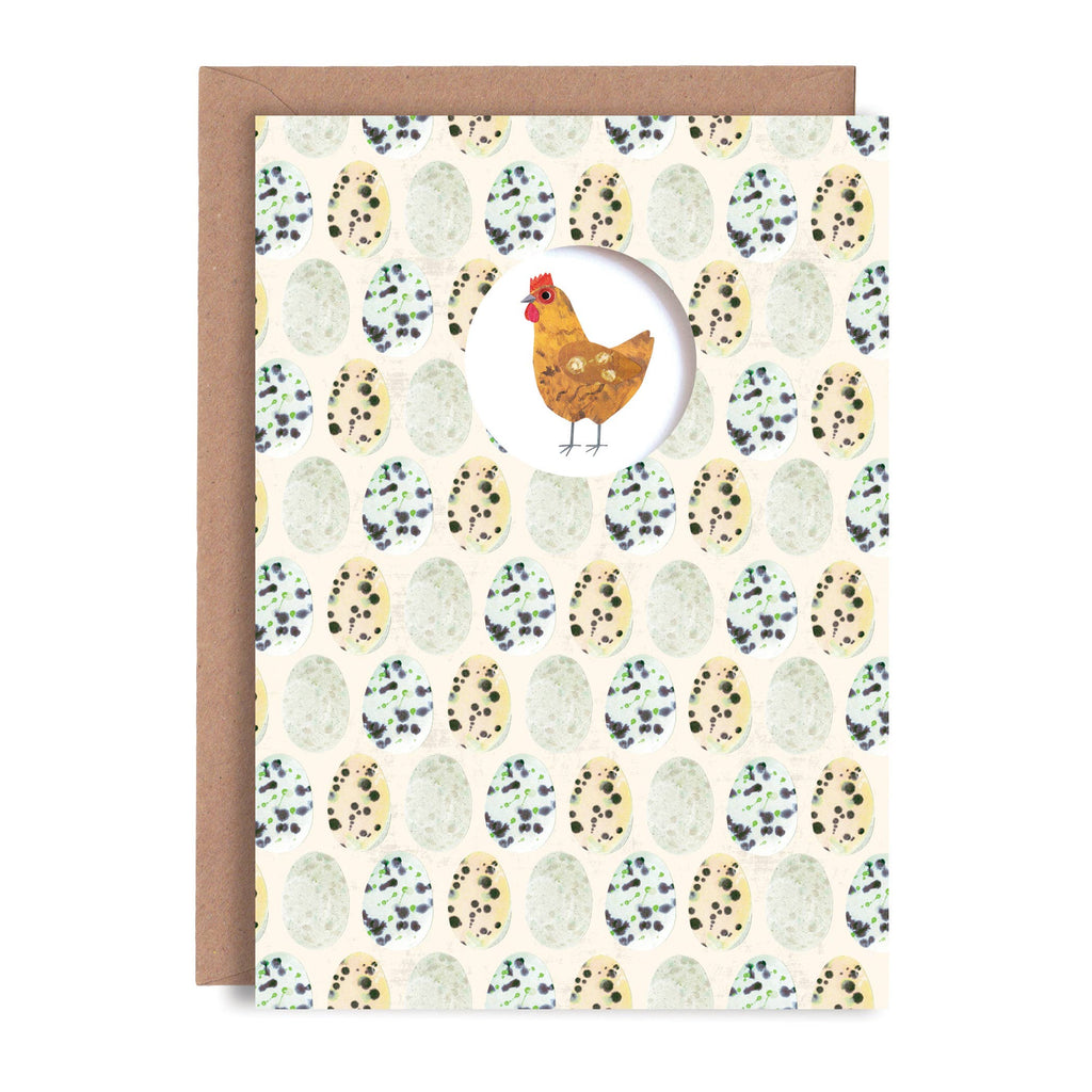 Featuring a speckled egg design this special card has a die cut circle in the front, revealing a mini illustration of a chicken inside. Perfect for sending to friends and loved ones for Easter or Spring.