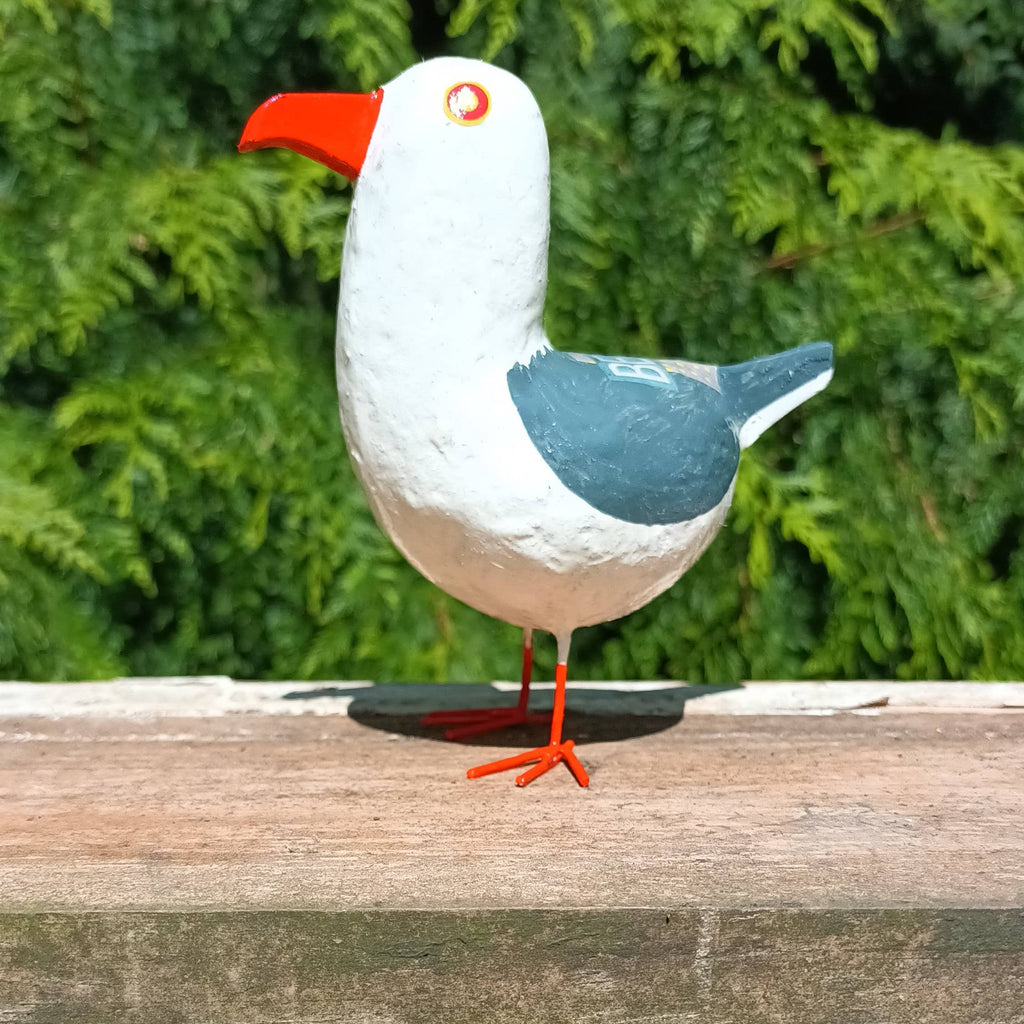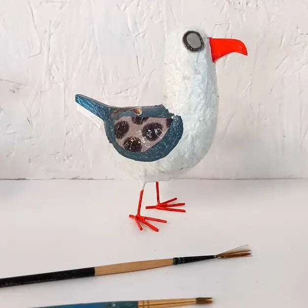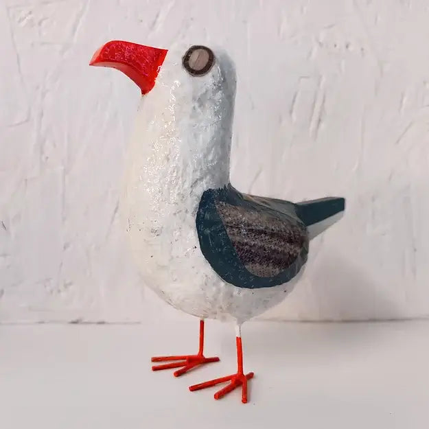 Handcrafted from salvaged materials and a top secret "posh "paper mache mix. This mini Seagull bird sculpture is made from a robust structure consisting of paper and reclaimed wood with metal feet attached to create a steady base.