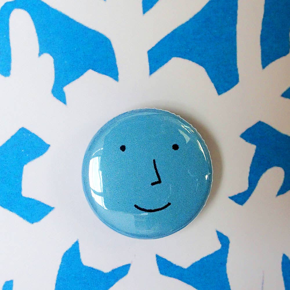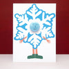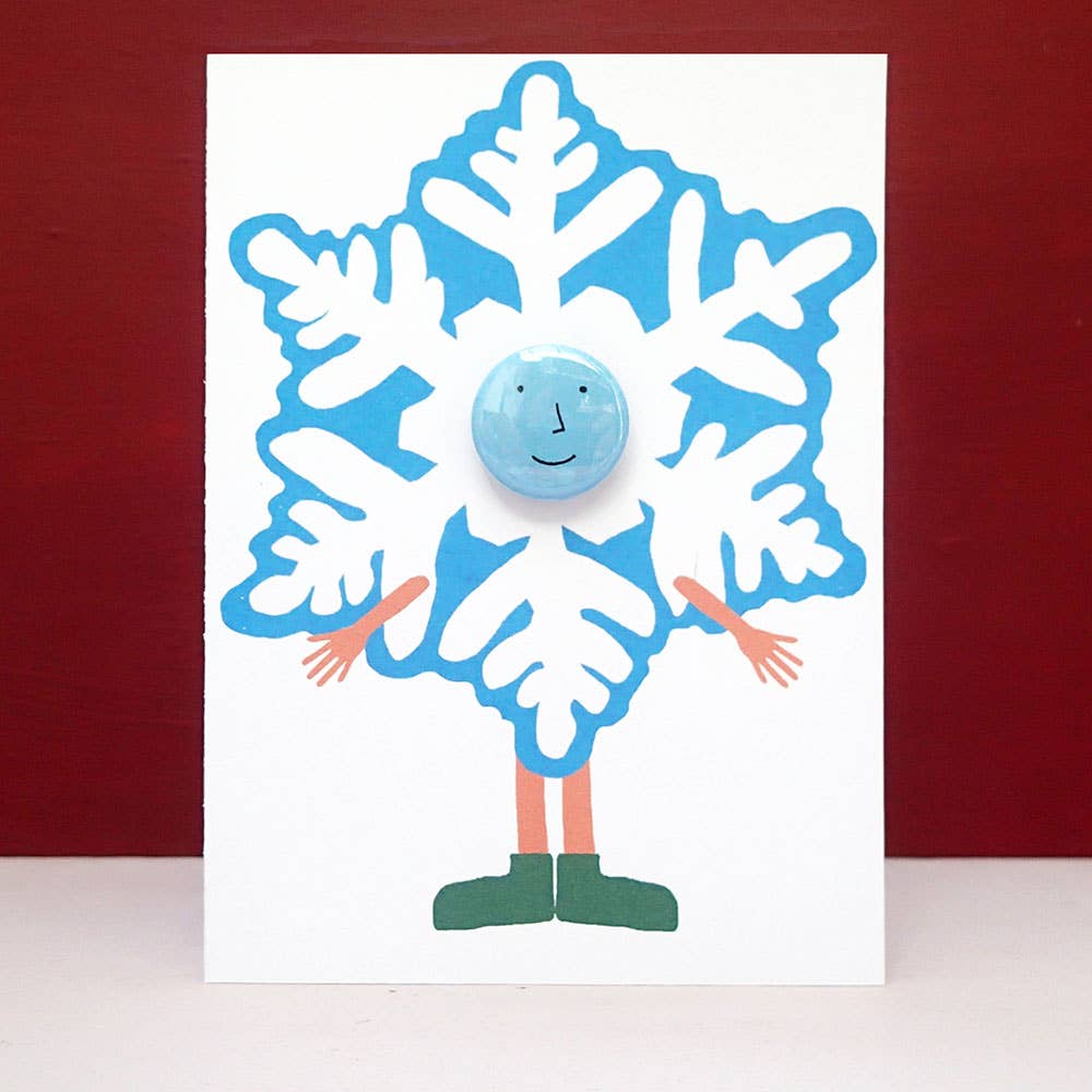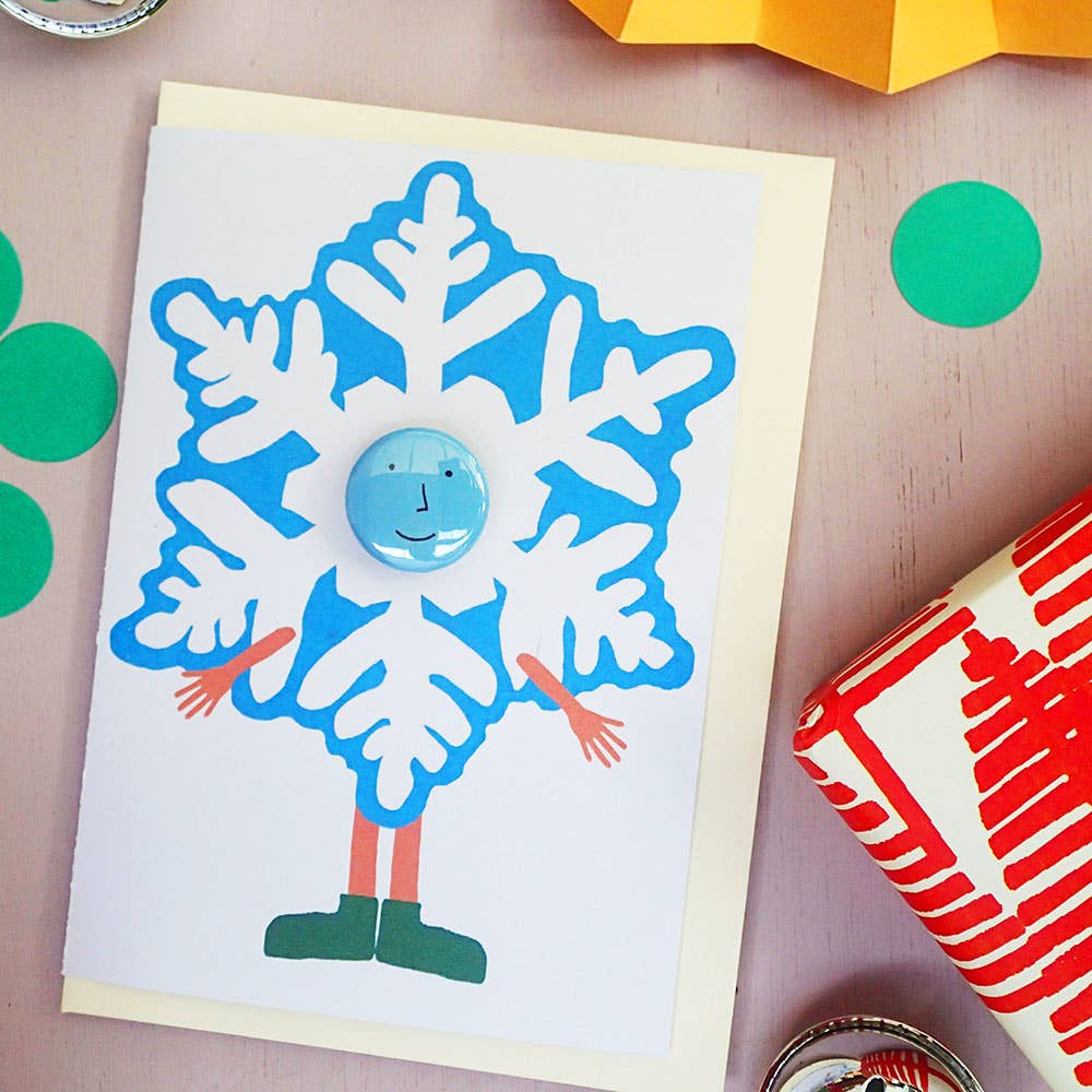 The simple design features an illustration of a person in a blue snowflake costume, their smiley face is a detachable badge, a fantastic festive addition for the recipient to wear on their Christmas jumper.