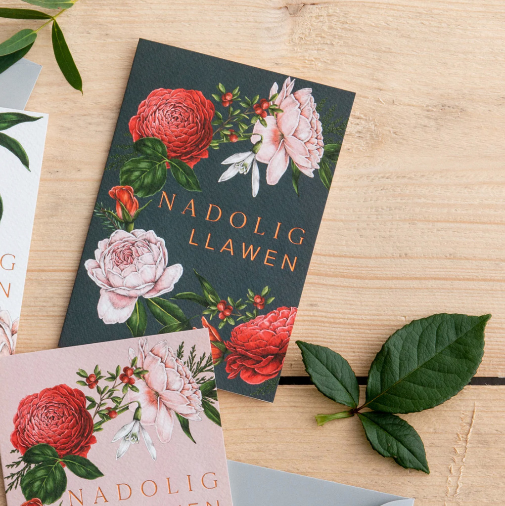 Featuring pink and red roses with winter foliage and berries against a navy background and copper foil detailing, with the Welsh language greeting 'Nadolig Llawen' which translates to 'Merry Christmas'.