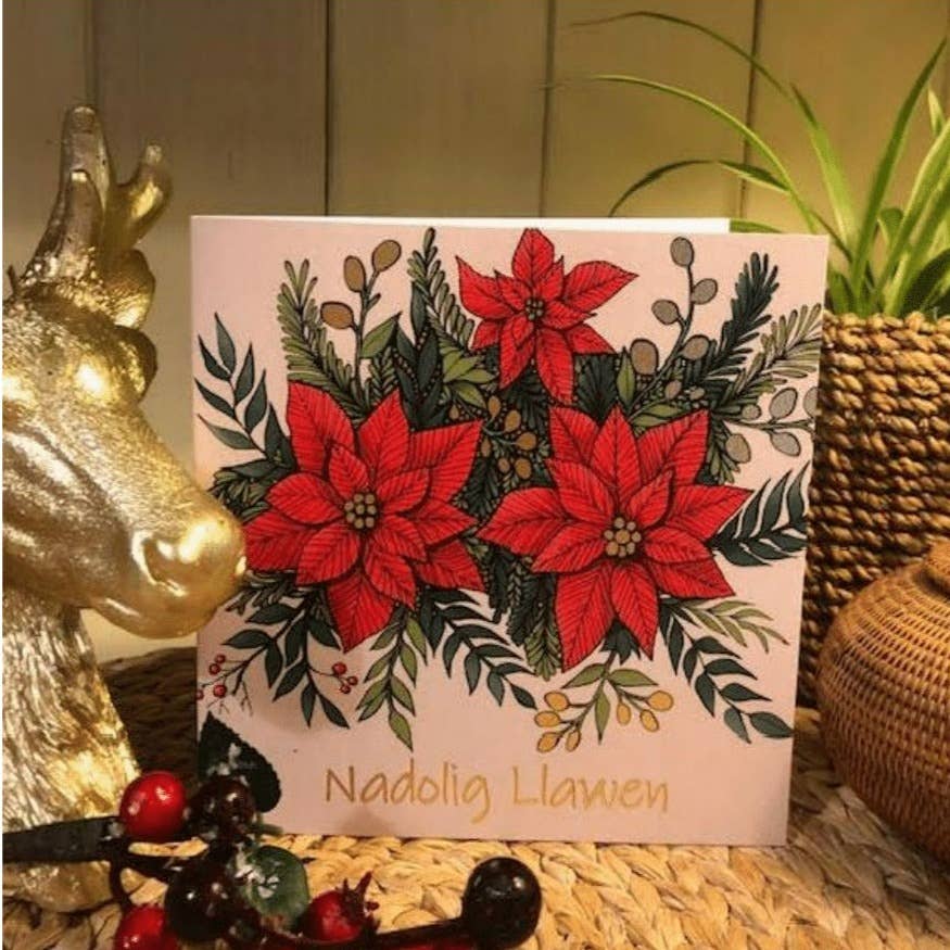 The illustration features bright red poinsettias and winter foliage against a cream background. This Welsh language Christmas card has the festive greeting 'Nadolig Llawen' which translates to 'Merry Christmas'.