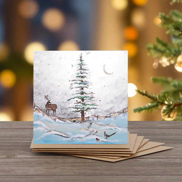 The wintery woodland scene depicts a Christmas tree housing robins and an owl against a moonlit winters night. A stag, rabbit and pheasant look upon the tree from the snow covered ground.