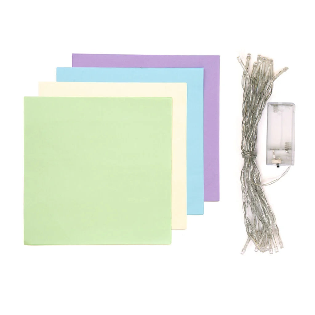 Contents: 20 pieces of paper in 4 colors, 13-foot-long string light with 20 LEDS, and it is battery powered! (2AA batteries required but not included)
