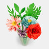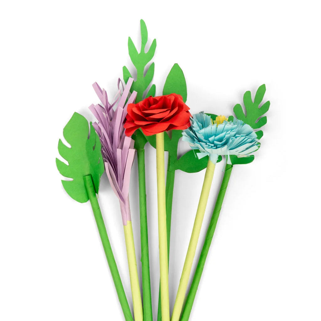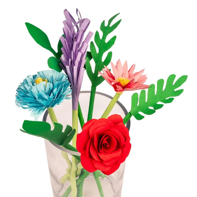 This craft kit makes four paper flowers, a rose, lily, lavender and carnation and four leaves.