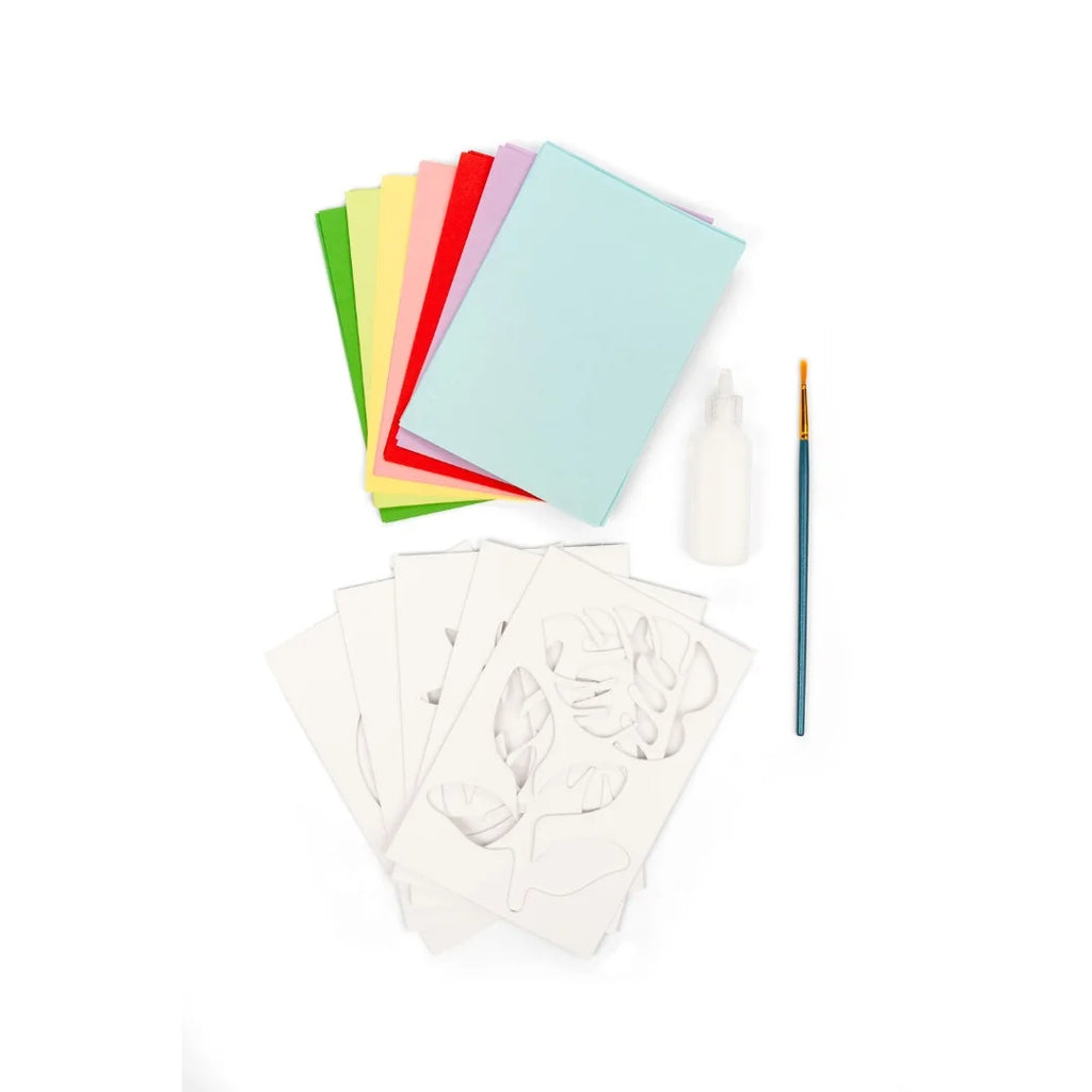 This craft kit contains paper, water-soluble, non- toxic PVA glue, application brush, and 5 stencils.