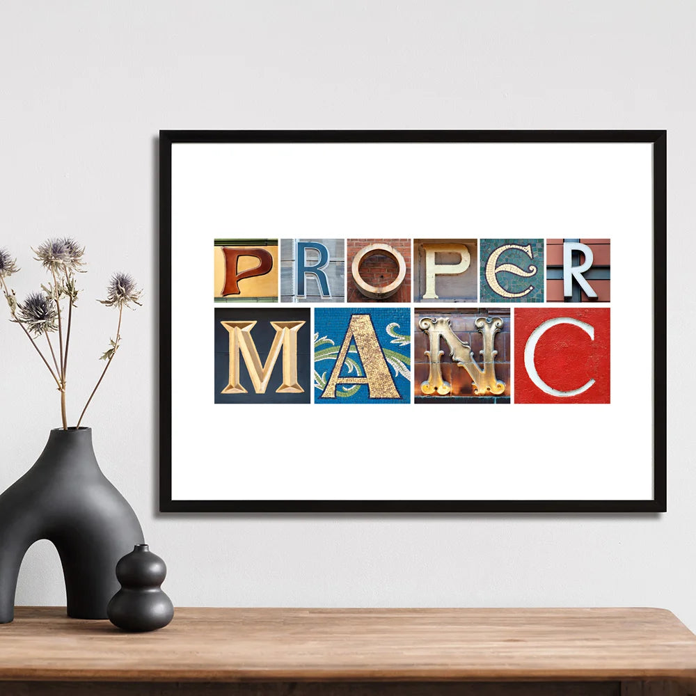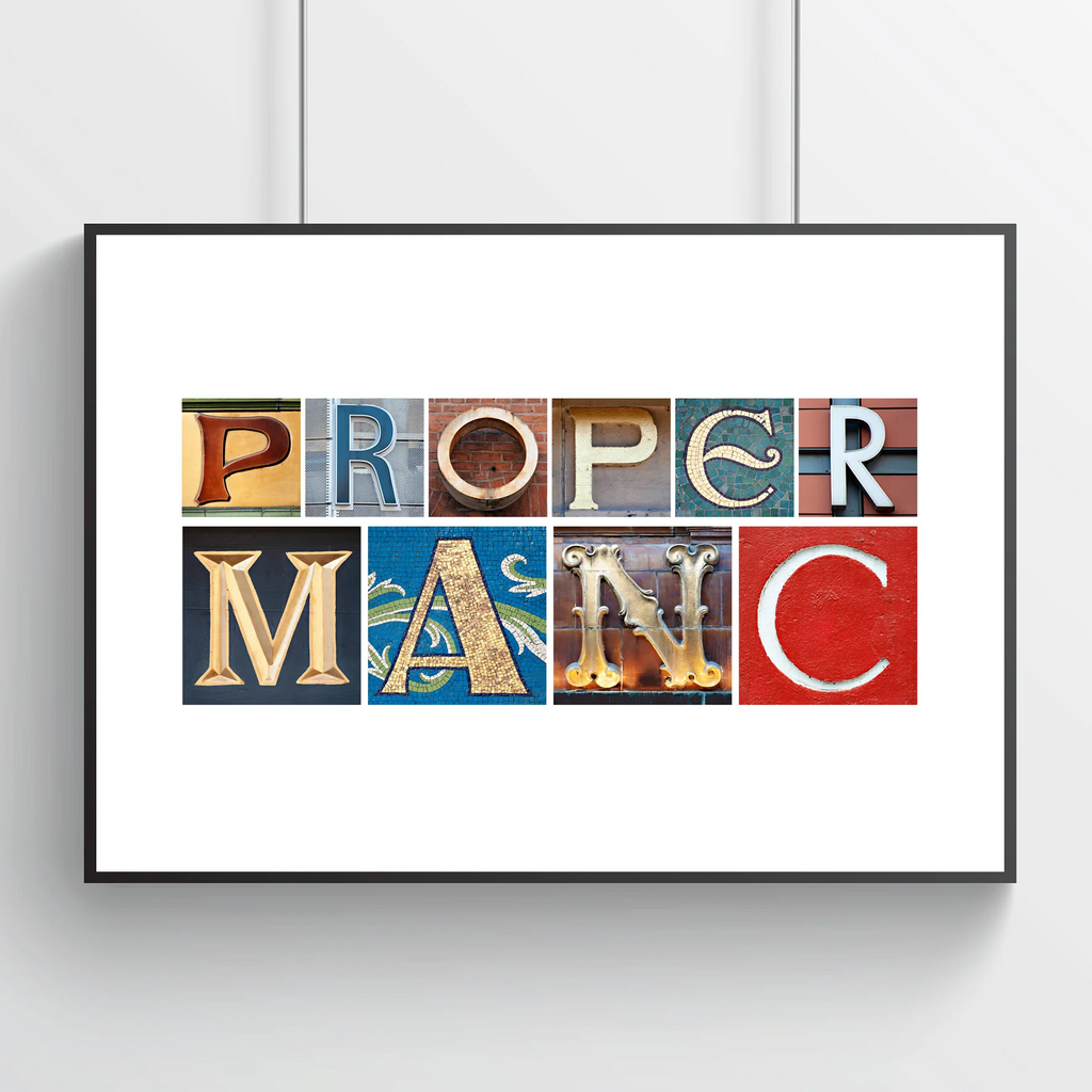 This Unframed Proper Manc Letters from Manchester A4 Art Print from Fonted has been created using photographs of letters found around Manchester.