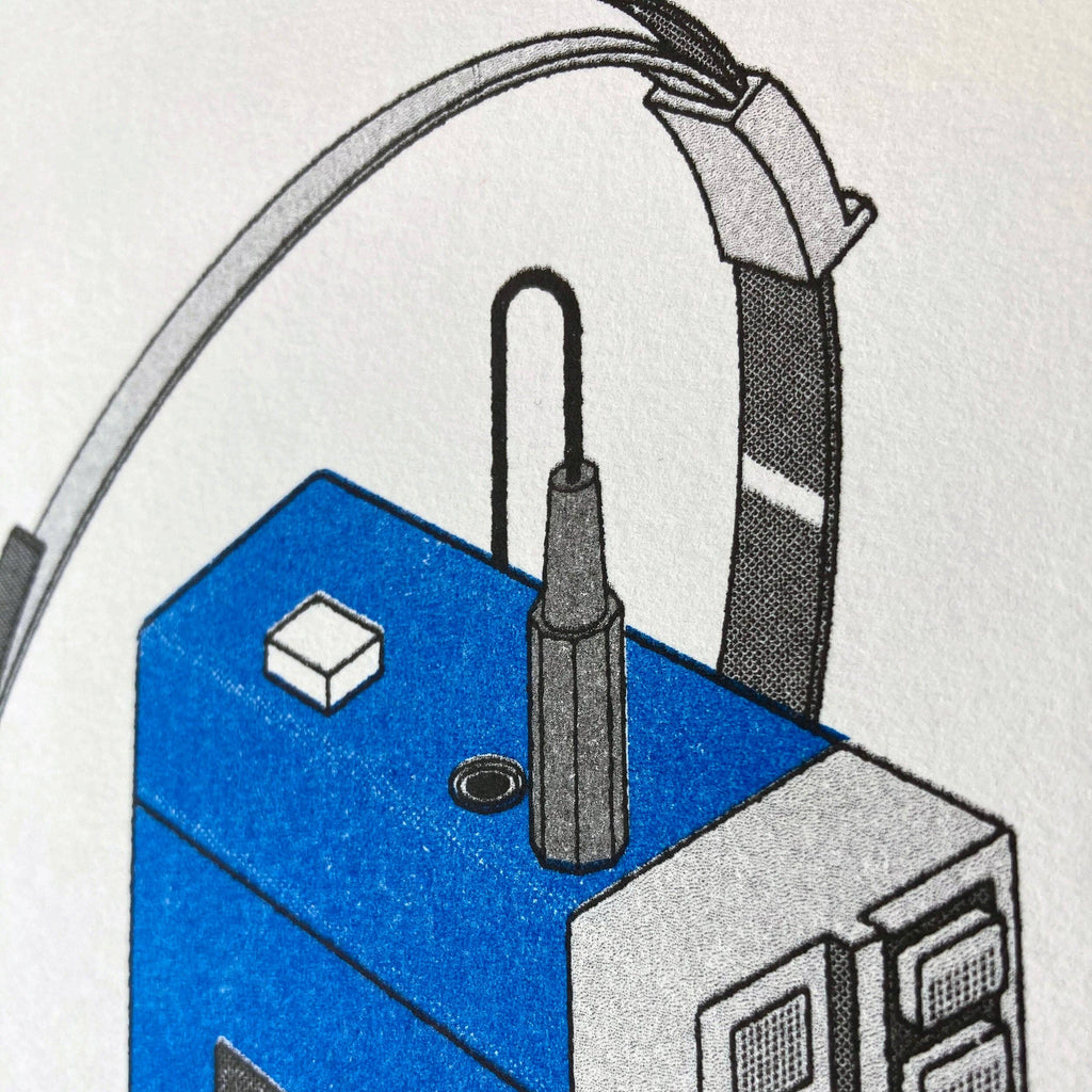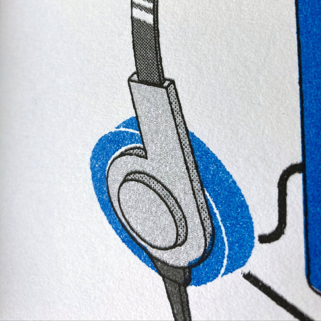 Inspired by retro gadgets and physical media, the retro 1979 Sony Walkman has been drawn by Matthew as an isometric drawing and printed using a Risograph printer using two colours of ink [Blue and Black]. The iconic Sony Walkman Risograph Art Print will bring back nostalgia for listening to your favourite cassette tapes on the move!